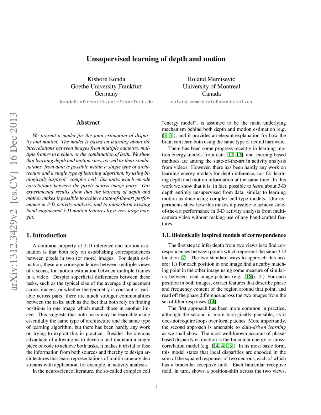 We present a model for the joint estimation of disparity and motion. The model is based on learning about the interrelations between images from multiple cameras, multiple frames in a video, or the combination of both. We show that learning depth and motion cues, as well as their combinations, from data is possible within a single type of architecture and a single type of learning algorithm, by using biologically inspired "complex cell" like units, which encode correlations between the pixels across image pairs. Our experimental results show that the learning of depth and motion makes it possible to achieve state-of-the-art performance in 3-D activity analysis, and to outperform existing hand-engineered 3-D motion features by a very large margin.