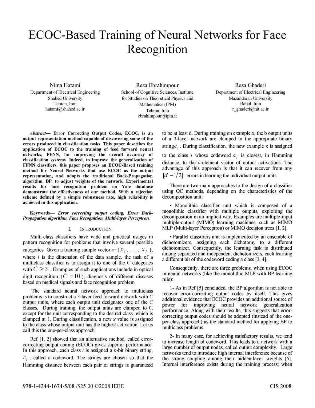 Error Correcting Output Codes, ECOC, is an output representation method capable of discovering some of the errors produced in classification tasks. This paper describes the application of ECOC to the training of feed forward neural networks, FFNN, for improving the overall accuracy of classification systems. Indeed, to improve the generalization of FFNN classifiers, this paper proposes an ECOC-Based training method for Neural Networks that use ECOC as the output representation, and adopts the traditional Back-Propagation algorithm, BP, to adjust weights of the network. Experimental results for face recognition problem on Yale database demonstrate the effectiveness of our method. With a rejection scheme defined by a simple robustness rate, high reliability is achieved in this application.