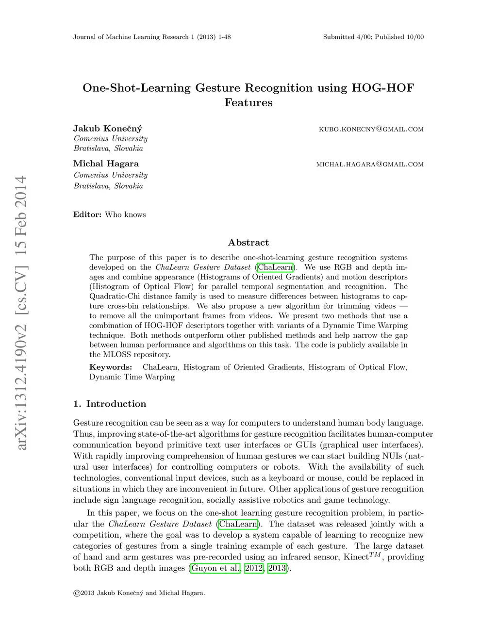 One-Shot-Learning Gesture Recognition using HOG-HOF Features