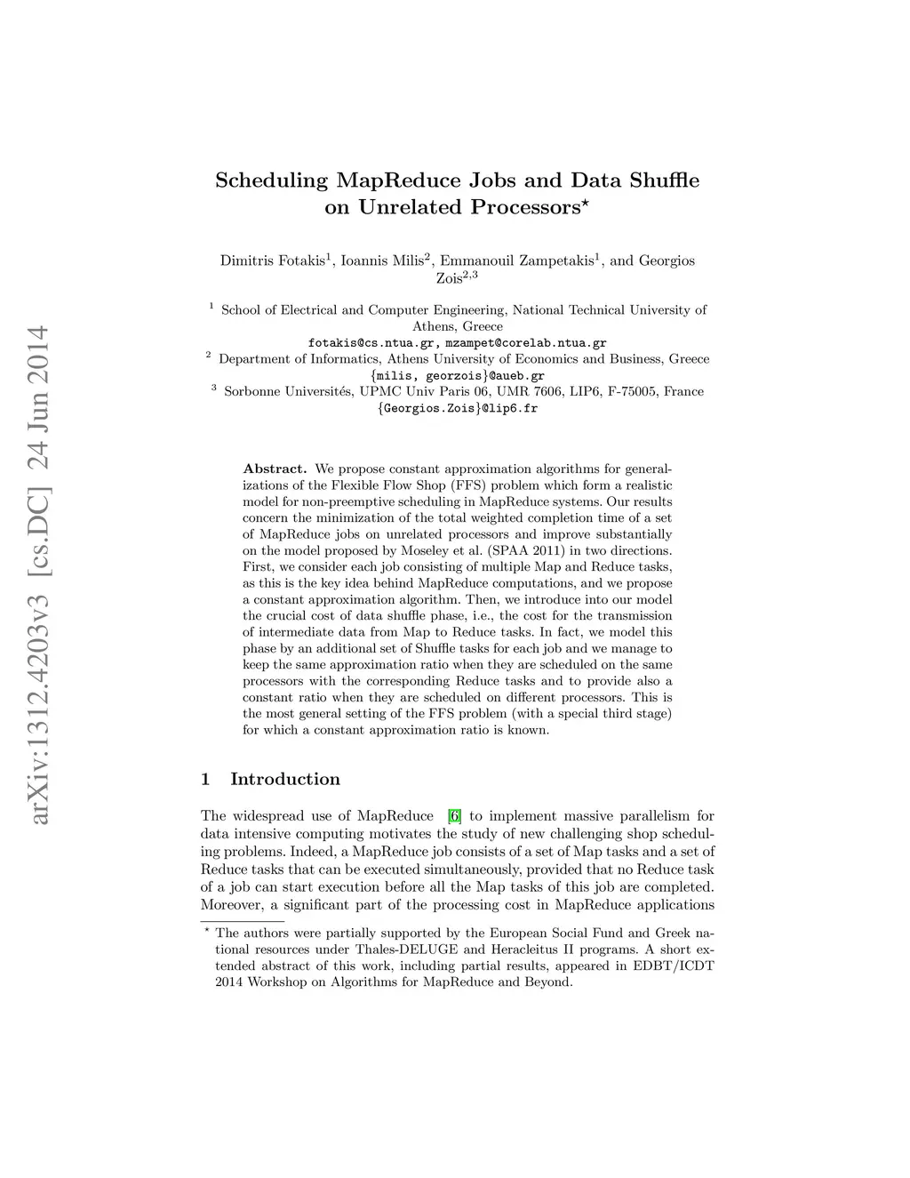 We propose constant approximation algorithms for generalizations of the Flexible Flow Shop (FFS) problem which form a realistic model for non-preemptive scheduling in MapReduce systems. Our results concern the minimization of the total weighted completion time of a set of MapReduce jobs on unrelated processors and improve substantially on the model proposed by Moseley et al. (SPAA 2011) in two directions. First, we consider each job consisting of multiple Map and Reduce tasks, as this is the key idea behind MapReduce computations, and we propose a constant approximation algorithm. Then, we introduce into our model the crucial cost of data shuffle phase, i.e., the cost for the transmission of intermediate data from Map to Reduce tasks. In fact, we model this phase by an additional set of Shuffle tasks for each job and we manage to keep the same approximation ratio when they are scheduled on the same processors with the corresponding Reduce tasks and to provide also a constant ratio when they are scheduled on different processors. This is the most general setting of the FFS problem (with a special third stage) for which a constant approximation ratio is known.