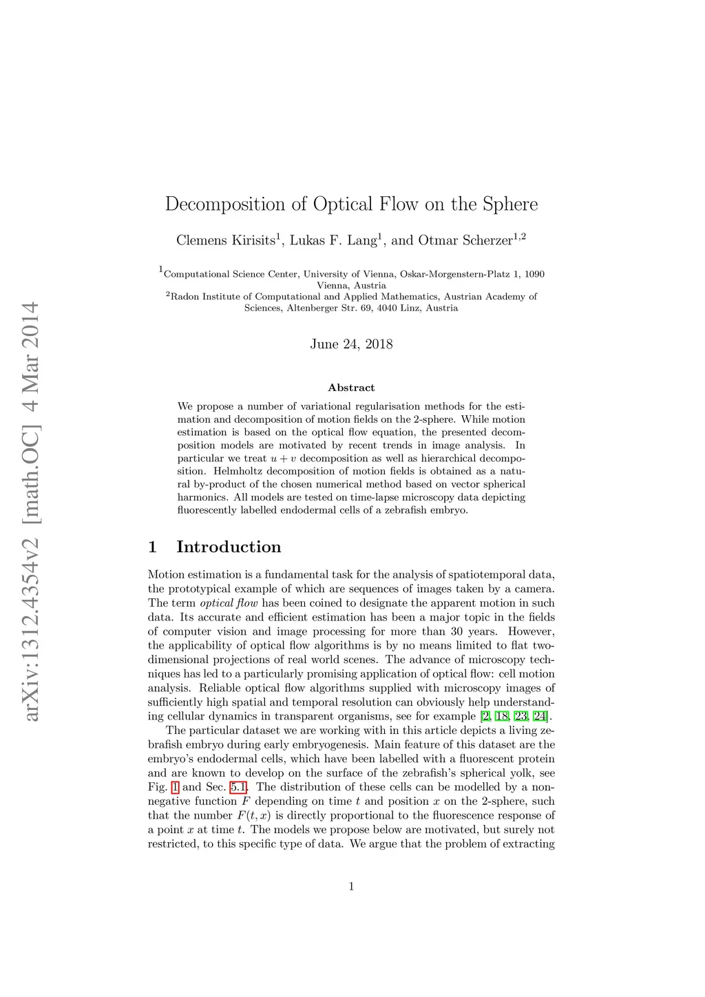 We propose a number of variational regularisation methods for the estimation and decomposition of motion fields on the -sphere. While motion estimation is based on the optical flow equation, the presented decomposition models are motivated by recent trends in image analysis. In particular we treat decomposition as well as hierarchical decomposition. Helmholtz decomposition of motion fields is obtained as a natural by-product of the chosen numerical method based on vector spherical harmonics. All models are tested on time-lapse microscopy data depicting fluorescently labelled endodermal cells of a zebrafish embryo.