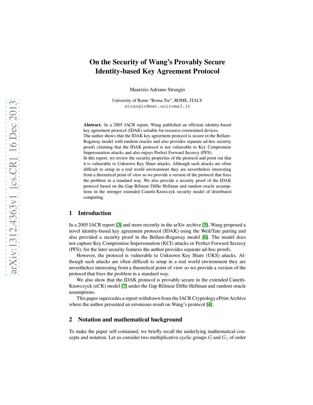 In a 2005 IACR report, Wang published an efficient identity-based key agreement protocol (IDAK) suitable for resource constrained devices. The author shows that the IDAK key agreement protocol is secure in the Bellare-Rogaway model with random oracles and also provides separate ad-hoc security proofs claiming that the IDAK protocol is not vulnerable to Key Compromise Impersonation attacks and also enjoys Perfect Forward Secrecy (PFS). In this report, we review the security properties of the protocol and point out that it is vulnerable to Unknown Key Share attacks. Although such attacks are often difficult to setup in a real world environment they are nevertheless interesting from a theoretical point of view so we provide a version of the protocol that fixes the problem in a standard way. We also provide a security proof of the IDAK protocol based on the Gap Bilinear Diffie Hellman and random oracle assumptions in the stronger extended Canetti-Krawczyk security model of distributed computing.