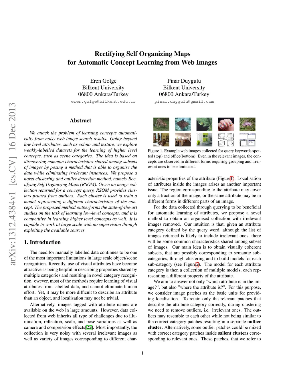 We attack the problem of learning concepts automatically from noisy web image search results. Going beyond low level attributes, such as colour and texture, we explore weakly-labelled datasets for the learning of higher level concepts, such as scene categories. The idea is based on discovering common characteristics shared among subsets of images by posing a method that is able to organise the data while eliminating irrelevant instances. We propose a novel clustering and outlier detection method, namely Rectifying Self Organizing Maps (RSOM). Given an image collection returned for a concept query, RSOM provides clusters pruned from outliers. Each cluster is used to train a model representing a different characteristics of the concept. The proposed method outperforms the state-of-the-art studies on the task of learning low-level concepts, and it is competitive in learning higher level concepts as well. It is capable to work at large scale with no supervision through exploiting the available sources.