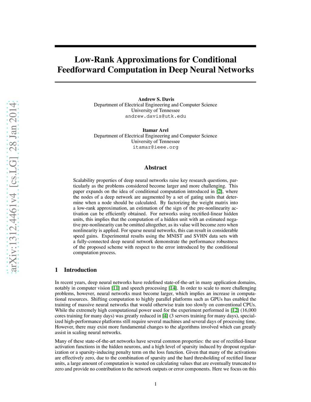 Scalability properties of deep neural networks raise key research questions, particularly as the problems considered become larger and more challenging. This paper expands on the idea of conditional computation introduced by Bengio, et. al., where the nodes of a deep network are augmented by a set of gating units that determine when a node should be calculated. By factorizing the weight matrix into a low-rank approximation, an estimation of the sign of the pre-nonlinearity activation can be efficiently obtained. For networks using rectified-linear hidden units, this implies that the computation of a hidden unit with an estimated negative pre-nonlinearity can be ommitted altogether, as its value will become zero when nonlinearity is applied. For sparse neural networks, this can result in considerable speed gains. Experimental results using the MNIST and SVHN data sets with a fully-connected deep neural network demonstrate the performance robustness of the proposed scheme with respect to the error introduced by the conditional computation process.