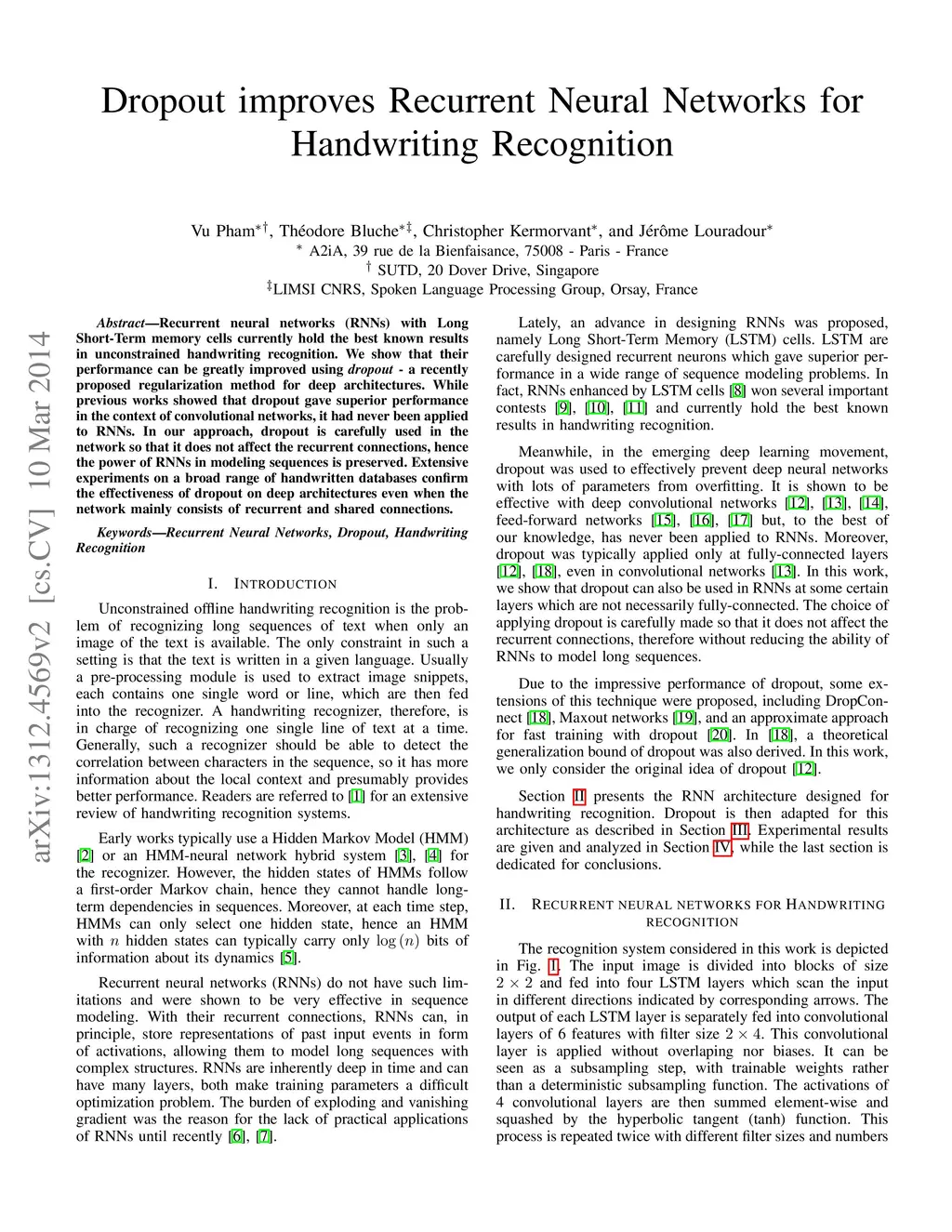Dropout improves Recurrent Neural Networks for Handwriting Recognition
