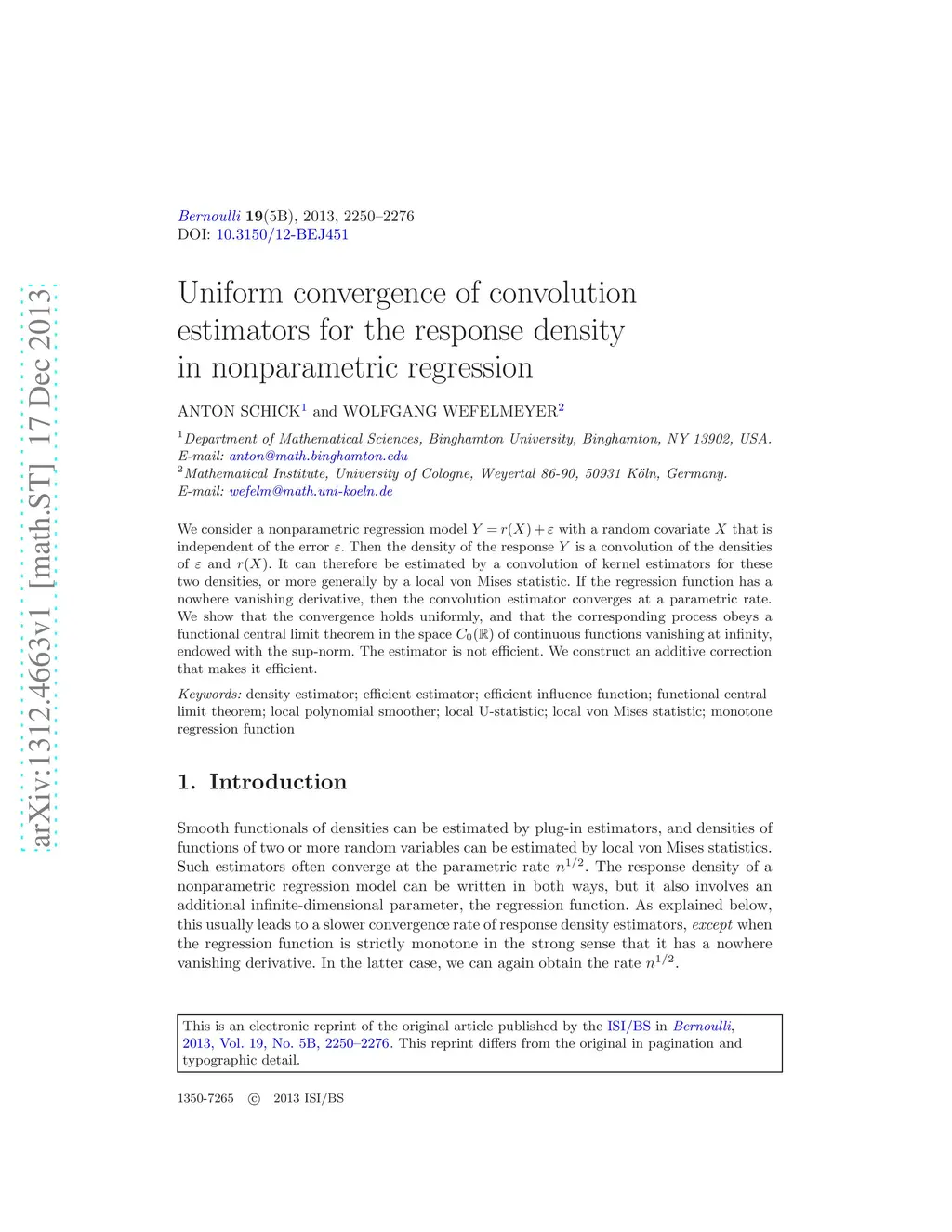 We consider a nonparametric regression model with a random covariate that is independent of the error . Then the density of the response is a convolution of the densities of and . It can therefore be estimated by a convolution of kernel estimators for these two densities, or more generally by a local von Mises statistic. If the regression function has a nowhere vanishing derivative, then the convolution estimator converges at a parametric rate. We show that the convergence holds uniformly, and that the corresponding process obeys a functional central limit theorem in the space of continuous functions vanishing at infinity, endowed with the sup-norm. The estimator is not efficient. We construct an additive correction that makes it efficient.