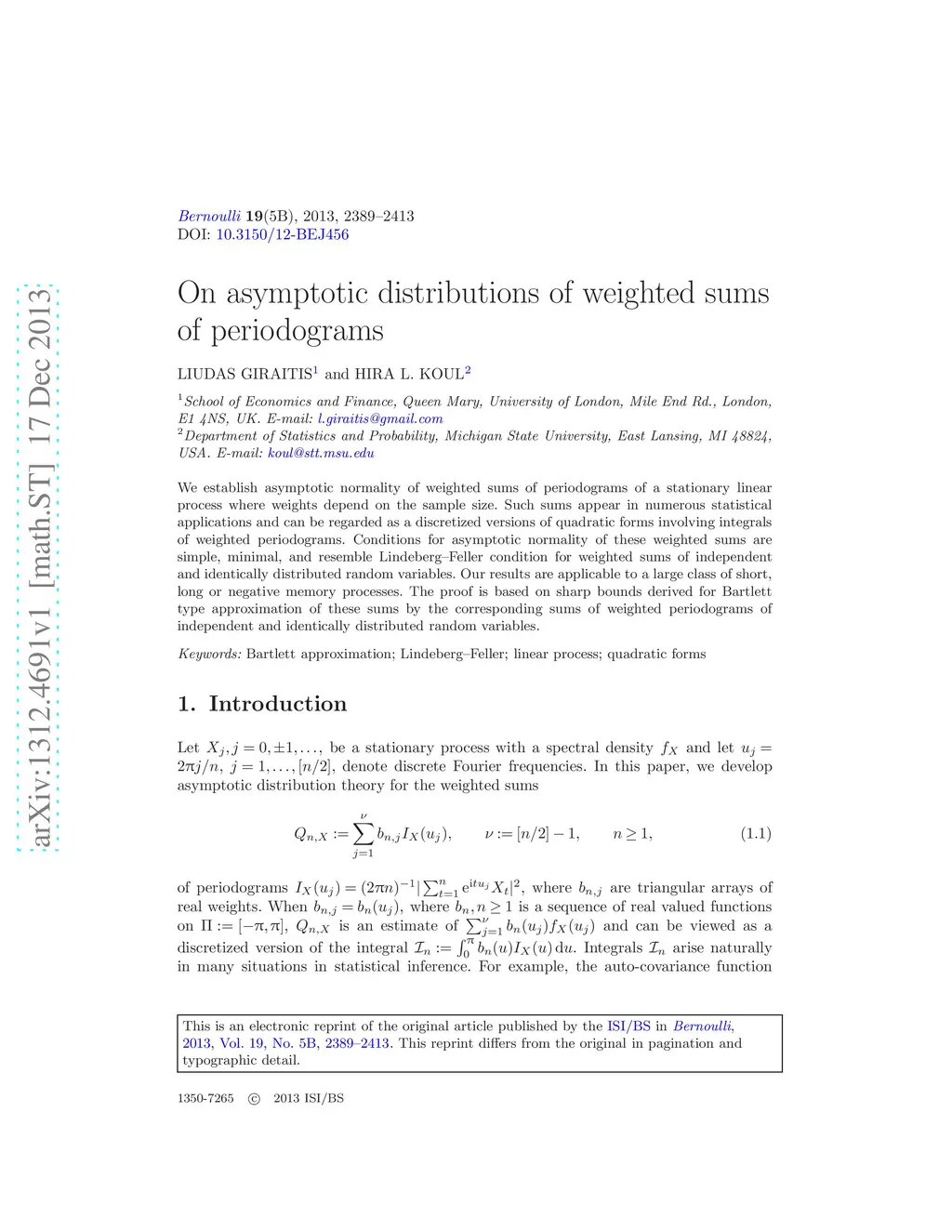 We establish asymptotic normality of weighted sums of periodograms of a stationary linear process where weights depend on the sample size. Such sums appear in numerous statistical applications and can be regarded as a discretized versions of quadratic forms involving integrals of weighted periodograms. Conditions for asymptotic normality of these weighted sums are simple, minimal, and resemble Lindeberg-Feller condition for weighted sums of independent and identically distributed random variables. Our results are applicable to a large class of short, long or negative memory processes. The proof is based on sharp bounds derived for Bartlett type approximation of these sums by the corresponding sums of weighted periodograms of independent and identically distributed random variables.