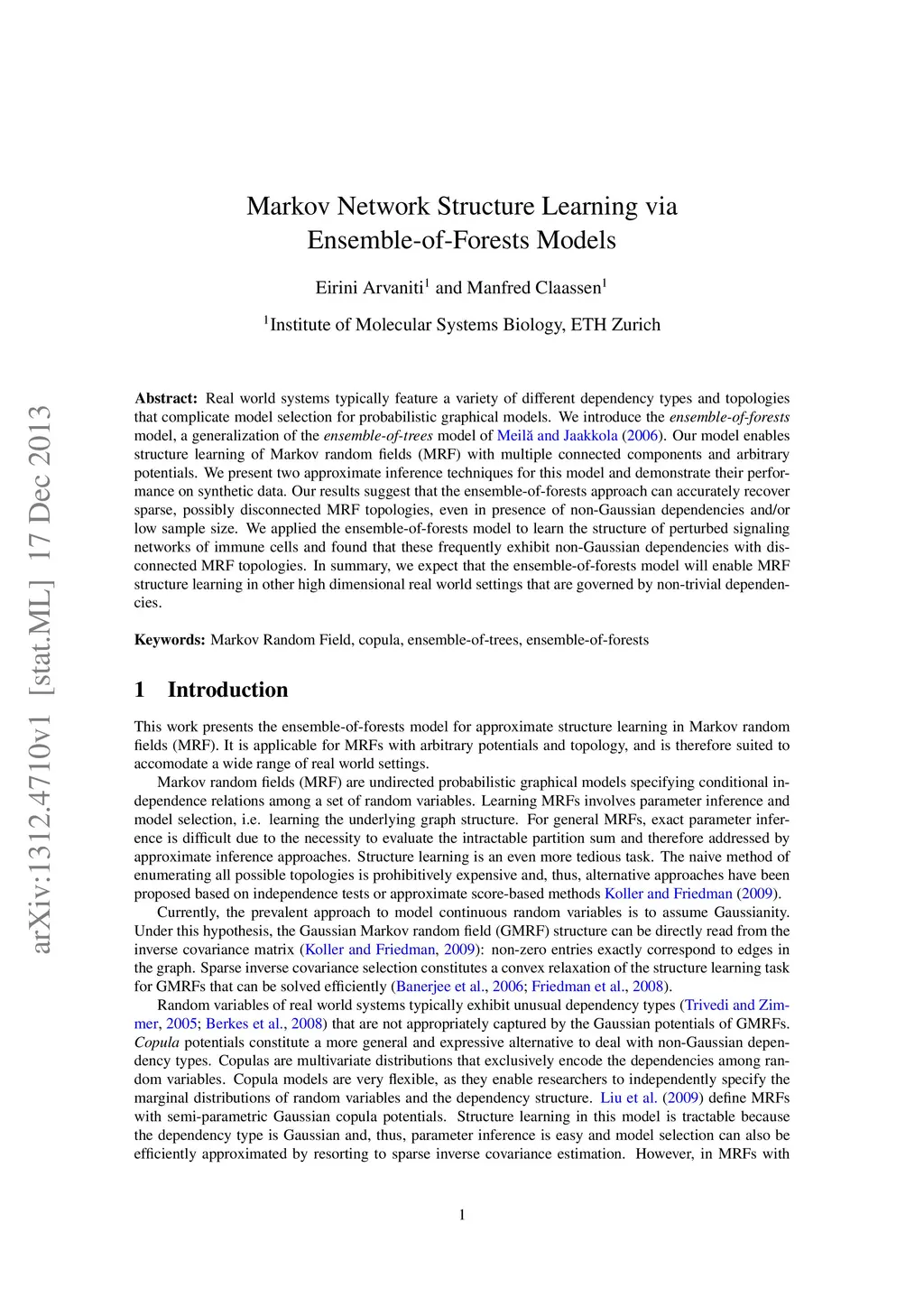 Real world systems typically feature a variety of different dependency types and topologies that complicate model selection for probabilistic graphical models. We introduce the ensemble-of-forests model, a generalization of the ensemble-of-trees model. Our model enables structure learning of Markov random fields (MRF) with multiple connected components and arbitrary potentials. We present two approximate inference techniques for this model and demonstrate their performance on synthetic data. Our results suggest that the ensemble-of-forests approach can accurately recover sparse, possibly disconnected MRF topologies, even in presence of non-Gaussian dependencies and/or low sample size. We applied the ensemble-of-forests model to learn the structure of perturbed signaling networks of immune cells and found that these frequently exhibit non-Gaussian dependencies with disconnected MRF topologies. In summary, we expect that the ensemble-of-forests model will enable MRF structure learning in other high dimensional real world settings that are governed by non-trivial dependencies.