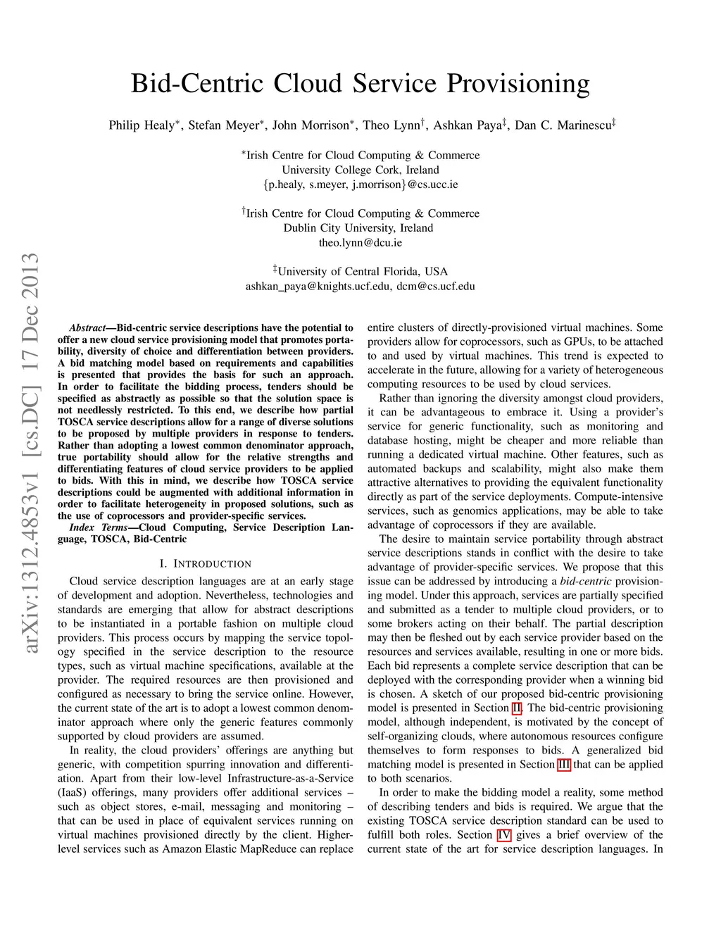 Bid-centric service descriptions have the potential to offer a new cloud service provisioning model that promotes portability, diversity of choice and differentiation between providers. A bid matching model based on requirements and capabilities is presented that provides the basis for such an approach. In order to facilitate the bidding process, tenders should be specified as abstractly as possible so that the solution space is not needlessly restricted. To this end, we describe how partial TOSCA service descriptions allow for a range of diverse solutions to be proposed by multiple providers in response to tenders. Rather than adopting a lowest common denominator approach, true portability should allow for the relative strengths and differentiating features of cloud service providers to be applied to bids. With this in mind, we describe how TOSCA service descriptions could be augmented with additional information in order to facilitate heterogeneity in proposed solutions, such as the use of coprocessors and provider-specific services.