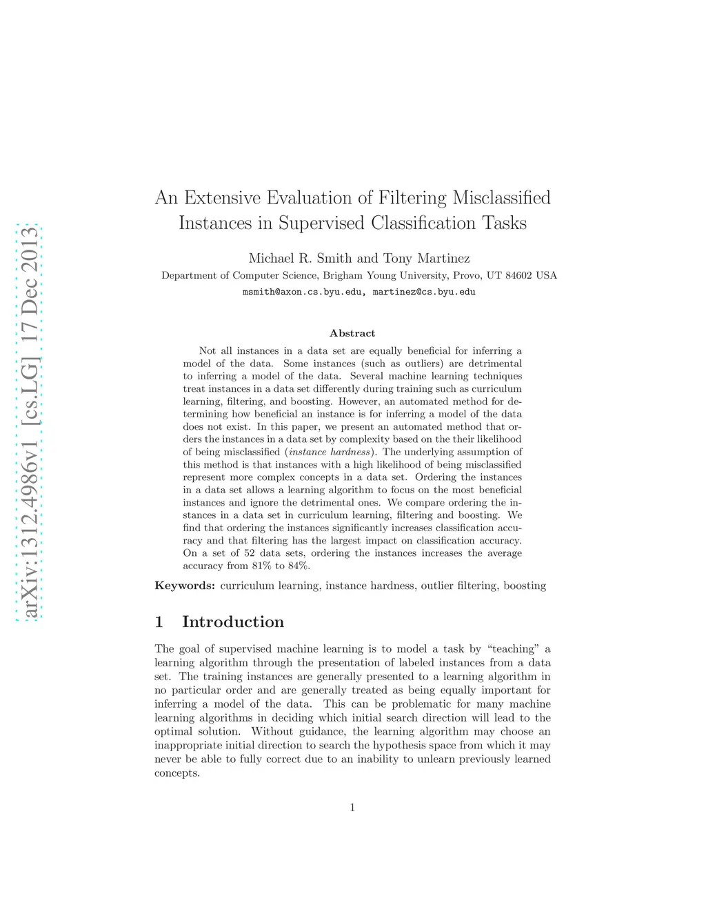 Not all instances in a data set are equally beneficial for inferring a model of the data. Some instances (such as outliers) are detrimental to inferring a model of the data. Several machine learning techniques treat instances in a data set differently during training such as curriculum learning, filtering, and boosting. However, an automated method for determining how beneficial an instance is for inferring a model of the data does not exist. In this paper, we present an automated method that orders the instances in a data set by complexity based on the their likelihood of being misclassified (instance hardness). The underlying assumption of this method is that instances with a high likelihood of being misclassified represent more complex concepts in a data set. Ordering the instances in a data set allows a learning algorithm to focus on the most beneficial instances and ignore the detrimental ones. We compare ordering the instances in a data set in curriculum learning, filtering and boosting. We find that ordering the instances significantly increases classification accuracy and that filtering has the largest impact on classification accuracy. On a set of 52 data sets, ordering the instances increases the average accuracy from 81% to 84%.
