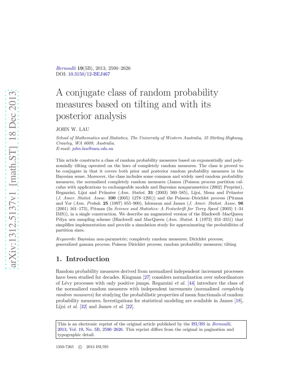 This article constructs a class of random probability measures based on exponentially and polynomially tilting operated on the laws of completely random measures. The class is proved to be conjugate in that it covers both prior and posterior random probability measures in the Bayesian sense. Moreover, the class includes some common and widely used random probability measures, the normalized completely random measures (James (Poisson process partition calculus with applications to exchangeable models and Bayesian nonparametrics (2002) Preprint), Regazzini, Lijoi and Pr\"{u}nster (Ann. Statist. 31 (2003) 560-585), Lijoi, Mena and Pr\"{u}nster (J. Amer. Statist. Assoc. 100 (2005) 1278-1291)) and the Poisson-Dirichlet process (Pitman and Yor (Ann. Probab. 25 (1997) 855-900), Ishwaran and James (J. Amer. Statist. Assoc. 96 (2001) 161-173), Pitman (In Science and Statistics: A Festschrift for Terry Speed (2003) 1-34 IMS)), in a single construction. We describe an augmented version of the Blackwell-MacQueen P\'{o}lya urn sampling scheme (Blackwell and MacQueen (Ann. Statist. 1 (1973) 353-355)) that simplifies implementation and provide a simulation study for approximating the probabilities of partition sizes.