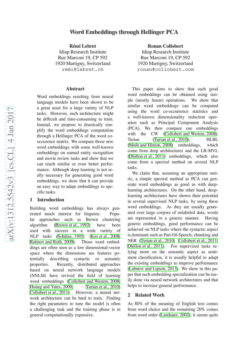 Word Emdeddings through Hellinger PCA