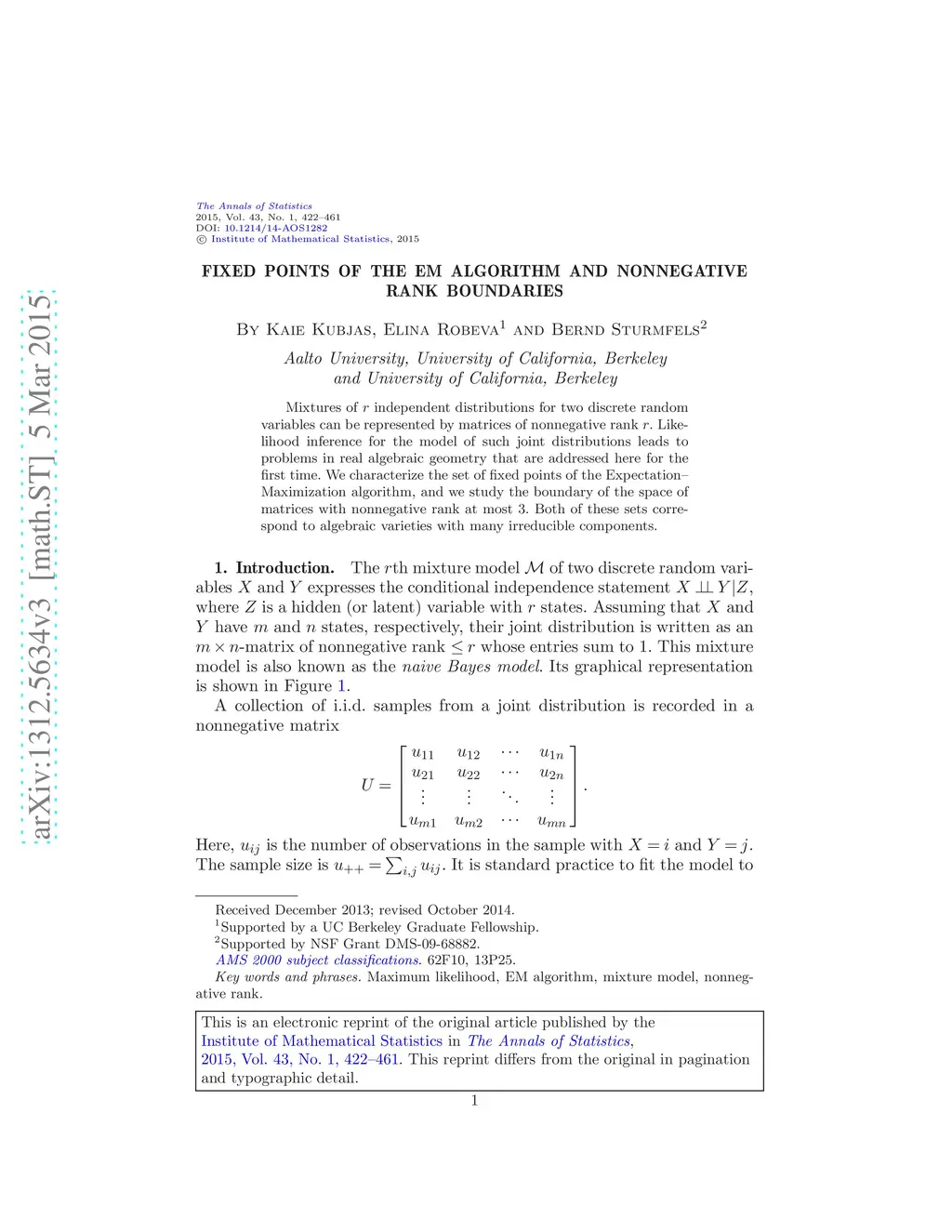 Mixtures of independent distributions for two discrete random variables can be represented by matrices of nonnegative rank . Likelihood inference for the model of such joint distributions leads to problems in real algebraic geometry that are addressed here for the first time. We characterize the set of fixed points of the Expectation-Maximization algorithm, and we study the boundary of the space of matrices with nonnegative rank at most . Both of these sets correspond to algebraic varieties with many irreducible components.