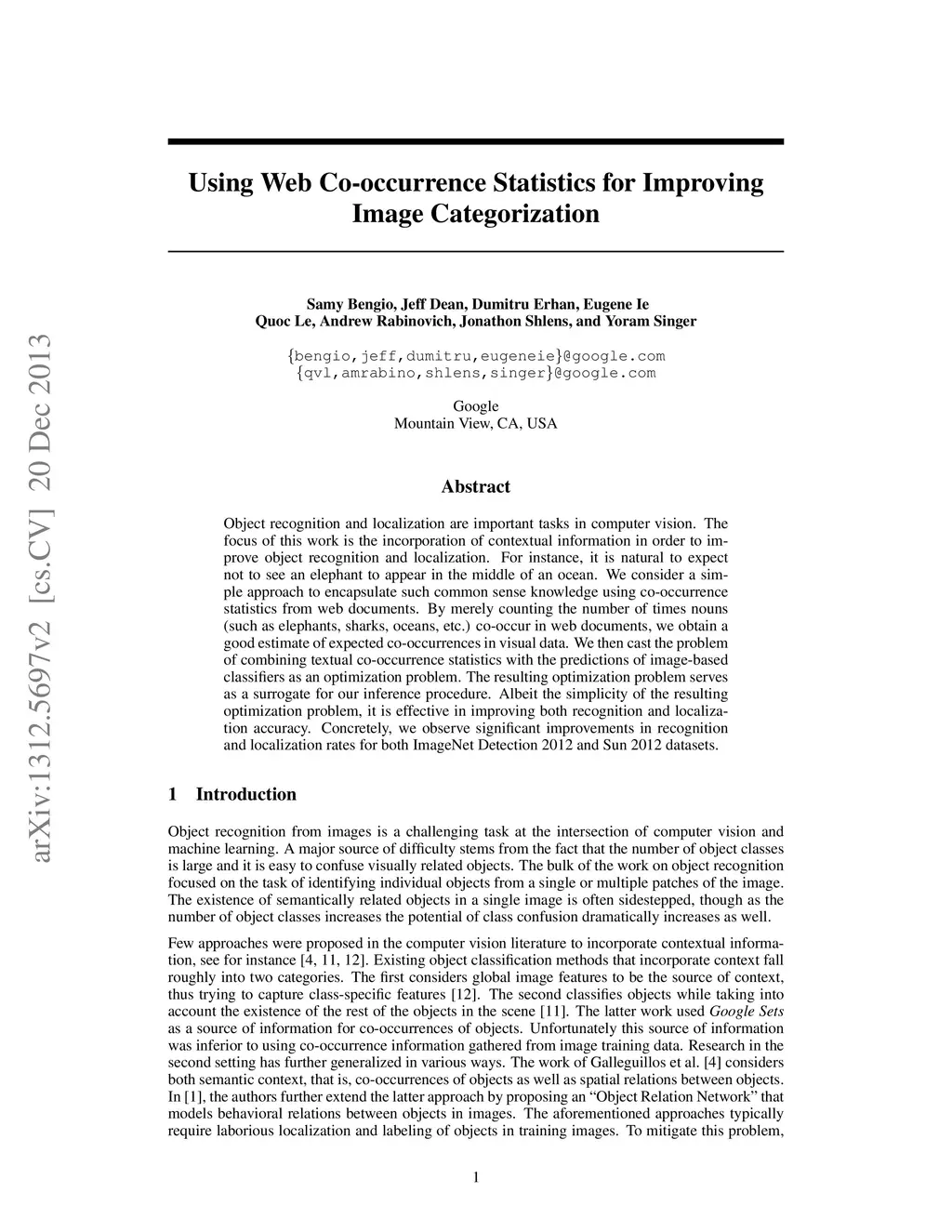 Object recognition and localization are important tasks in computer vision. The focus of this work is the incorporation of contextual information in order to improve object recognition and localization. For instance, it is natural to expect not to see an elephant to appear in the middle of an ocean. We consider a simple approach to encapsulate such common sense knowledge using co-occurrence statistics from web documents. By merely counting the number of times nouns (such as elephants, sharks, oceans, etc.) co-occur in web documents, we obtain a good estimate of expected co-occurrences in visual data. We then cast the problem of combining textual co-occurrence statistics with the predictions of image-based classifiers as an optimization problem. The resulting optimization problem serves as a surrogate for our inference procedure. Albeit the simplicity of the resulting optimization problem, it is effective in improving both recognition and localization accuracy. Concretely, we observe significant improvements in recognition and localization rates for both ImageNet Detection 2012 and Sun 2012 datasets.