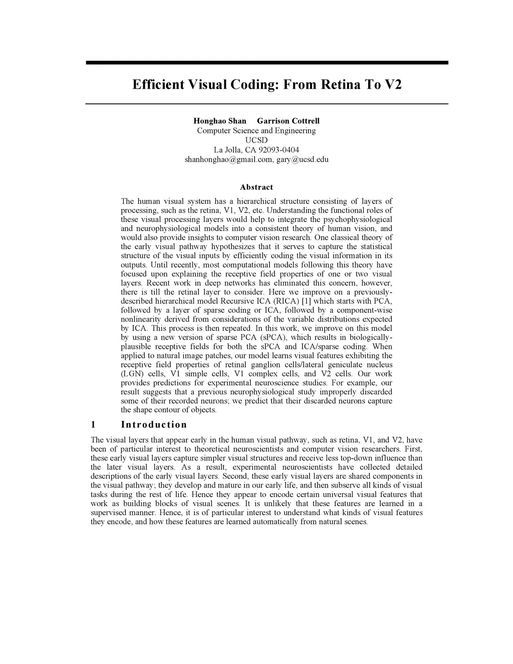The human visual system has a hierarchical structure consisting of layers of processing, such as the retina, V1, V2, etc. Understanding the functional roles of these visual processing layers would help to integrate the psychophysiological and neurophysiological models into a consistent theory of human vision, and would also provide insights to computer vision research. One classical theory of the early visual pathway hypothesizes that it serves to capture the statistical structure of the visual inputs by efficiently coding the visual information in its outputs. Until recently, most computational models following this theory have focused upon explaining the receptive field properties of one or two visual layers. Recent work in deep networks has eliminated this concern, however, there is till the retinal layer to consider. Here we improve on a previously-described hierarchical model Recursive ICA (RICA) [1] which starts with PCA, followed by a layer of sparse coding or ICA, followed by a component-wise nonlinearity derived from considerations of the variable distributions expected by ICA. This process is then repeated. In this work, we improve on this model by using a new version of sparse PCA (sPCA), which results in biologically-plausible receptive fields for both the sPCA and ICA/sparse coding. When applied to natural image patches, our model learns visual features exhibiting the receptive field properties of retinal ganglion cells/lateral geniculate nucleus (LGN) cells, V1 simple cells, V1 complex cells, and V2 cells. Our work provides predictions for experimental neuroscience studies. For example, our result suggests that a previous neurophysiological study improperly discarded some of their recorded neurons; we predict that their discarded neurons capture the shape contour of objects.