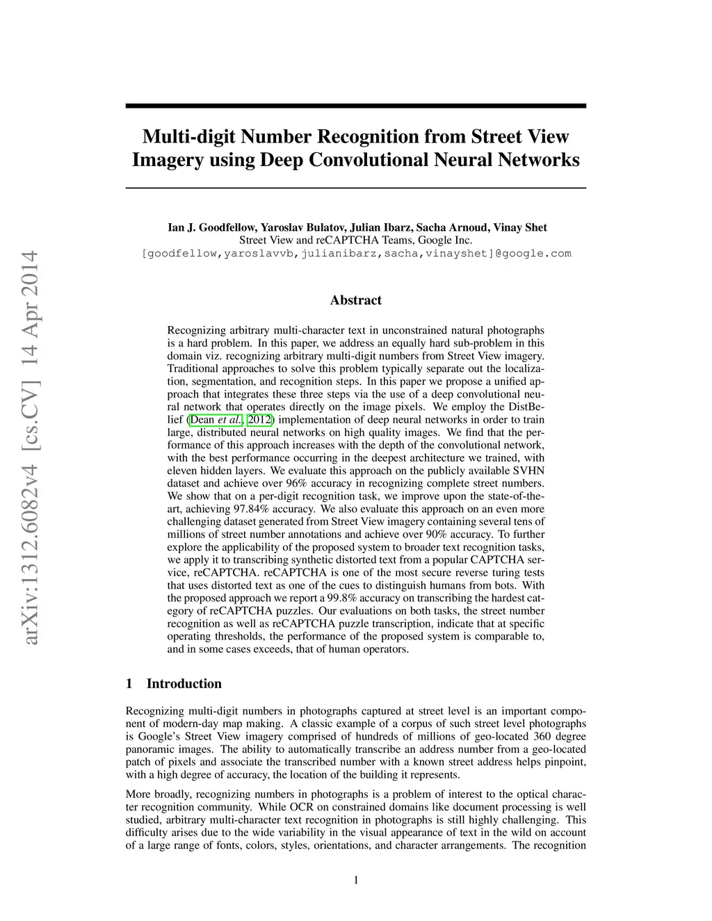 Recognizing arbitrary multi-character text in unconstrained natural photographs is a hard problem. In this paper, we address an equally hard sub-problem in this domain viz. recognizing arbitrary multi-digit numbers from Street View imagery. Traditional approaches to solve this problem typically separate out the localization, segmentation, and recognition steps. In this paper we propose a unified approach that integrates these three steps via the use of a deep convolutional neural network that operates directly on the image pixels. We employ the DistBelief implementation of deep neural networks in order to train large, distributed neural networks on high quality images. We find that the performance of this approach increases with the depth of the convolutional network, with the best performance occurring in the deepest architecture we trained, with eleven hidden layers. We evaluate this approach on the publicly available SVHN dataset and achieve over accuracy in recognizing complete street numbers. We show that on a per-digit recognition task, we improve upon the state-of-the-art, achieving accuracy. We also evaluate this approach on an even more challenging dataset generated from Street View imagery containing several tens of millions of street number annotations and achieve over accuracy. To further explore the applicability of the proposed system to broader text recognition tasks, we apply it to synthetic distorted text from reCAPTCHA. reCAPTCHA is one of the most secure reverse turing tests that uses distorted text to distinguish humans from bots. We report a accuracy on the hardest category of reCAPTCHA. Our evaluations on both tasks indicate that at specific operating thresholds, the performance of the proposed system is comparable to, and in some cases exceeds, that of human operators.