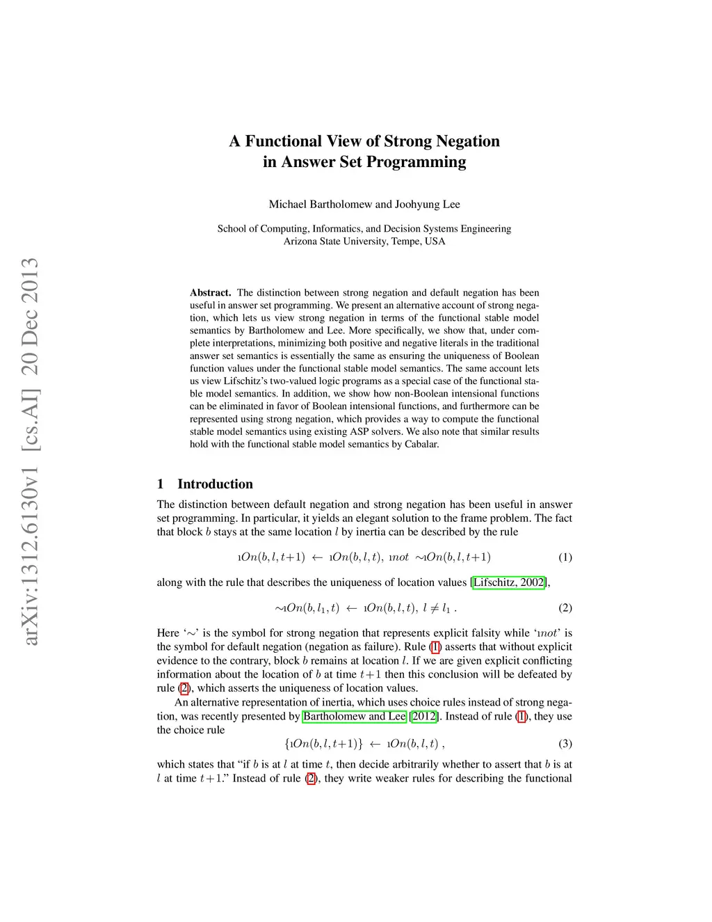 The distinction between strong negation and default negation has been useful in answer set programming. We present an alternative account of strong negation, which lets us view strong negation in terms of the functional stable model semantics by Bartholomew and Lee. More specifically, we show that, under complete interpretations, minimizing both positive and negative literals in the traditional answer set semantics is essentially the same as ensuring the uniqueness of Boolean function values under the functional stable model semantics. The same account lets us view Lifschitz's two-valued logic programs as a special case of the functional stable model semantics. In addition, we show how non-Boolean intensional functions can be eliminated in favor of Boolean intensional functions, and furthermore can be represented using strong negation, which provides a way to compute the functional stable model semantics using existing ASP solvers. We also note that similar results hold with the functional stable model semantics by Cabalar.