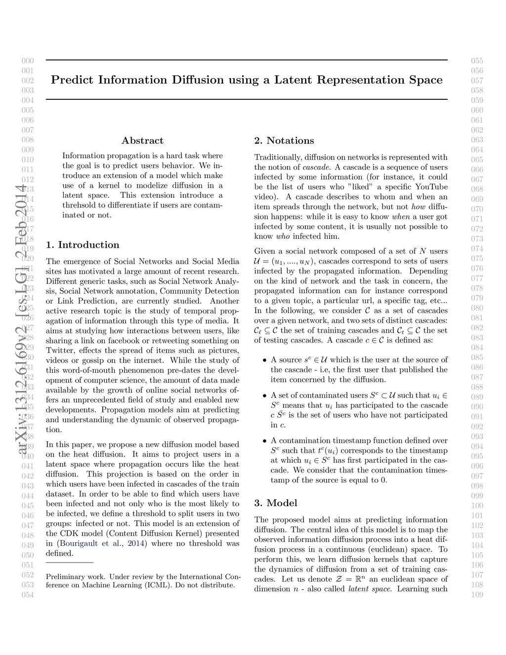 We introduce a model for predicting the diffusion of content information on social media. When propagation is usually modeled on discrete graph structures, we introduce here a continuous diffusion model, where nodes in a diffusion cascade are projected onto a latent space with the property that their proximity in this space reflects the temporal diffusion process. We focus on the task of predicting contaminated users for an initial initial information source and provide preliminary results on differents datasets.