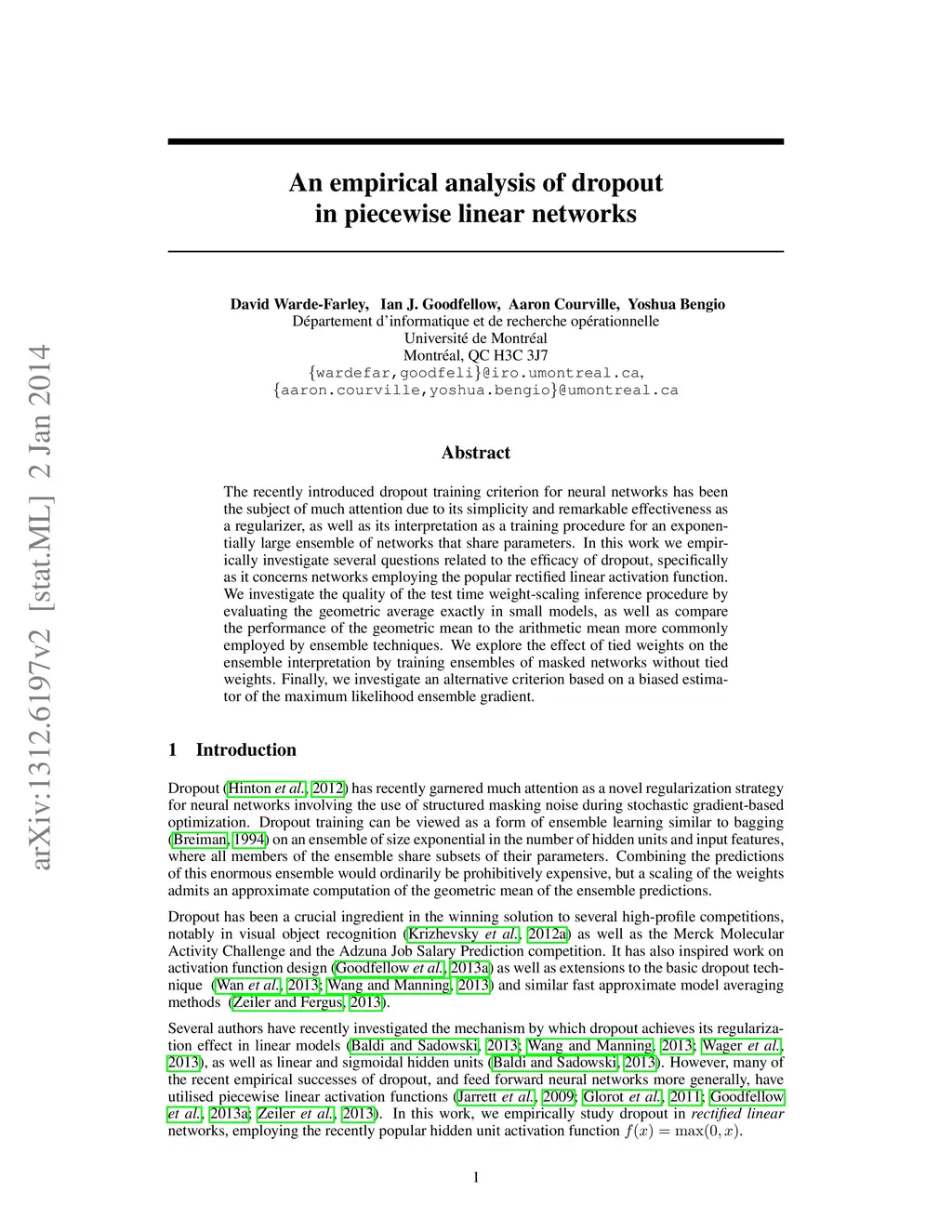 The recently introduced dropout training criterion for neural networks has been the subject of much attention due to its simplicity and remarkable effectiveness as a regularizer, as well as its interpretation as a training procedure for an exponentially large ensemble of networks that share parameters. In this work we empirically investigate several questions related to the efficacy of dropout, specifically as it concerns networks employing the popular rectified linear activation function. We investigate the quality of the test time weight-scaling inference procedure by evaluating the geometric average exactly in small models, as well as compare the performance of the geometric mean to the arithmetic mean more commonly employed by ensemble techniques. We explore the effect of tied weights on the ensemble interpretation by training ensembles of masked networks without tied weights. Finally, we investigate an alternative criterion based on a biased estimator of the maximum likelihood ensemble gradient.