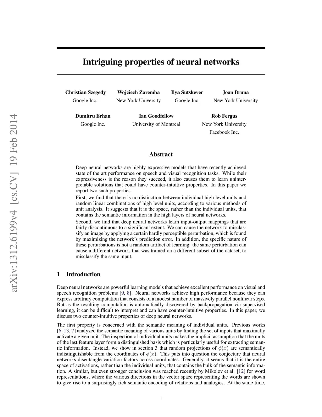 Deep neural networks are highly expressive models that have recently achieved state of the art performance on speech and visual recognition tasks. While their expressiveness is the reason they succeed, it also causes them to learn uninterpretable solutions that could have counter-intuitive properties. In this paper we report two such properties. First, we find that there is no distinction between individual high level units and random linear combinations of high level units, according to various methods of unit analysis. It suggests that it is the space, rather than the individual units, that contains of the semantic information in the high layers of neural networks. Second, we find that deep neural networks learn input-output mappings that are fairly discontinuous to a significant extend. We can cause the network to misclassify an image by applying a certain imperceptible perturbation, which is found by maximizing the network's prediction error. In addition, the specific nature of these perturbations is not a random artifact of learning: the same perturbation can cause a different network, that was trained on a different subset of the dataset, to misclassify the same input.