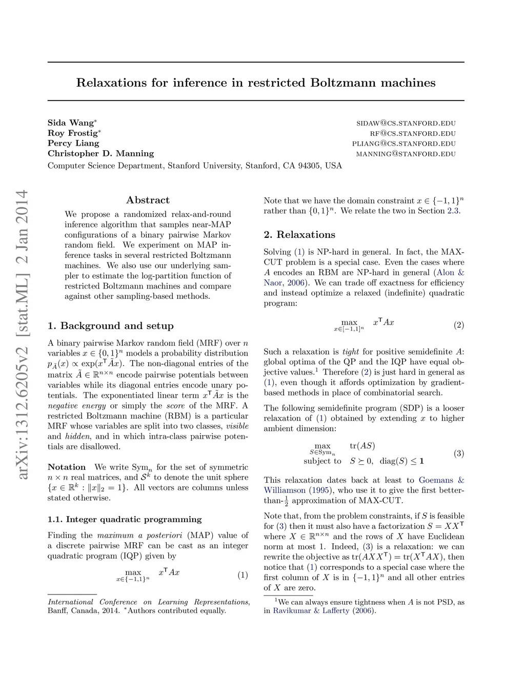 We propose a relaxation-based approximate inference algorithm that samples near-MAP configurations of a binary pairwise Markov random field. We experiment on MAP inference tasks in several restricted Boltzmann machines. We also use our underlying sampler to estimate the log-partition function of restricted Boltzmann machines and compare against other sampling-based methods.