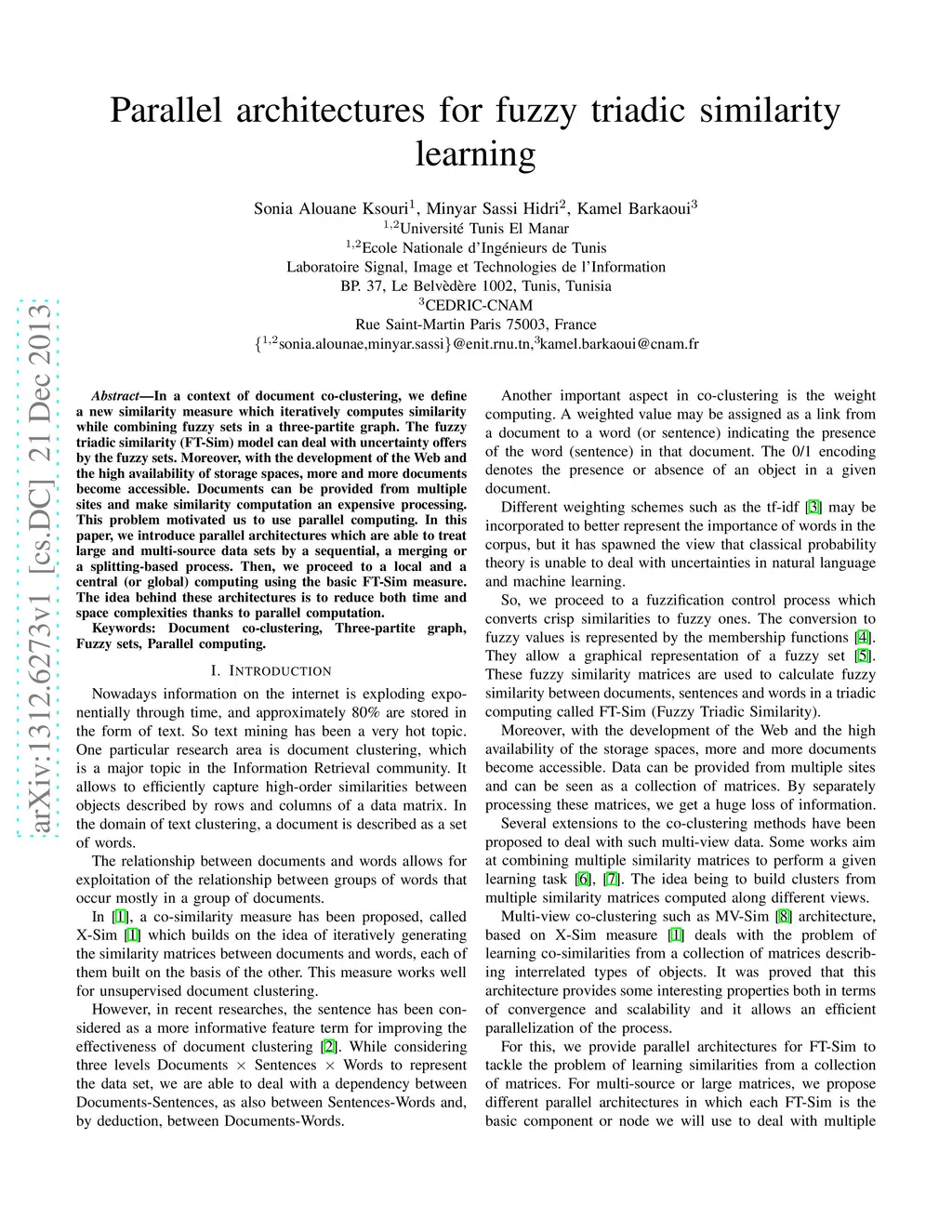 In a context of document co-clustering, we define a new similarity measure which iteratively computes similarity while combining fuzzy sets in a three-partite graph. The fuzzy triadic similarity (FT-Sim) model can deal with uncertainty offers by the fuzzy sets. Moreover, with the development of the Web and the high availability of storage spaces, more and more documents become accessible. Documents can be provided from multiple sites and make similarity computation an expensive processing. This problem motivated us to use parallel computing. In this paper, we introduce parallel architectures which are able to treat large and multi-source data sets by a sequential, a merging or a splitting-based process. Then, we proceed to a local and a central (or global) computing using the basic FT-Sim measure. The idea behind these architectures is to reduce both time and space complexities thanks to parallel computation.