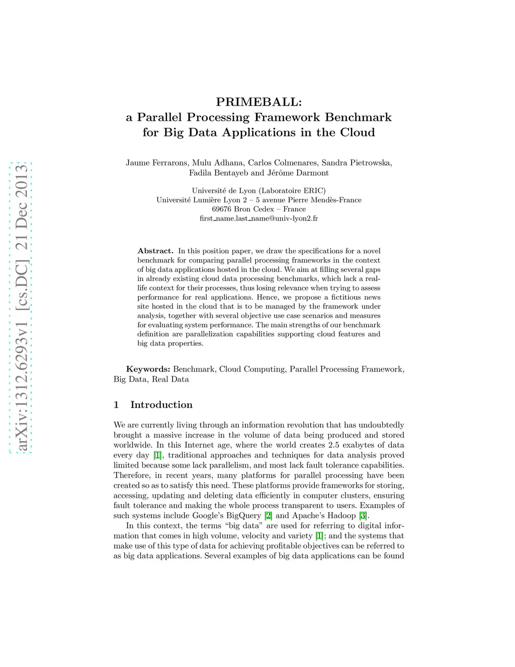PRIMEBALL: a Parallel Processing Framework Benchmark for Big Data