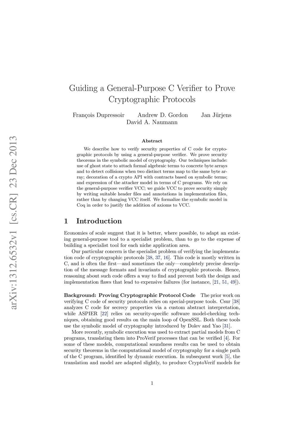We describe how to verify security properties of C code for cryptographic protocols by using a general-purpose verifier. We prove security theorems in the symbolic model of cryptography. Our techniques include: use of ghost state to attach formal algebraic terms to concrete byte arrays and to detect collisions when two distinct terms map to the same byte array; decoration of a crypto API with contracts based on symbolic terms; and expression of the attacker model in terms of C programs. We rely on the general-purpose verifier VCC; we guide VCC to prove security simply by writing suitable header files and annotations in implementation files, rather than by changing VCC itself. We formalize the symbolic model in Coq in order to justify the addition of axioms to VCC.
