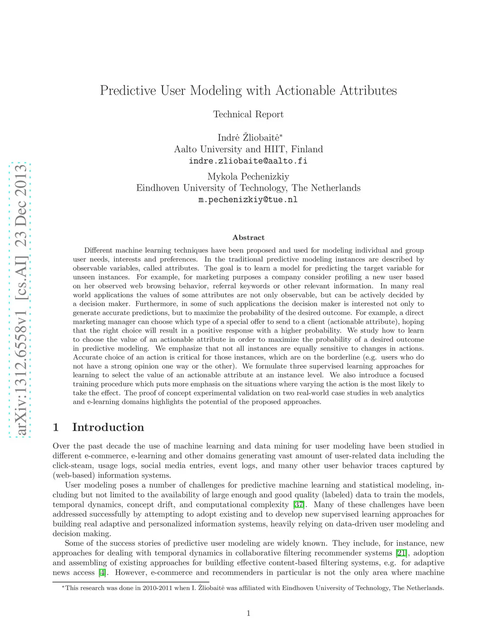 Different machine learning techniques have been proposed and used for modeling individual and group user needs, interests and preferences. In the traditional predictive modeling instances are described by observable variables, called attributes. The goal is to learn a model for predicting the target variable for unseen instances. For example, for marketing purposes a company consider profiling a new user based on her observed web browsing behavior, referral keywords or other relevant information. In many real world applications the values of some attributes are not only observable, but can be actively decided by a decision maker. Furthermore, in some of such applications the decision maker is interested not only to generate accurate predictions, but to maximize the probability of the desired outcome. For example, a direct marketing manager can choose which type of a special offer to send to a client (actionable attribute), hoping that the right choice will result in a positive response with a higher probability. We study how to learn to choose the value of an actionable attribute in order to maximize the probability of a desired outcome in predictive modeling. We emphasize that not all instances are equally sensitive to changes in actions. Accurate choice of an action is critical for those instances, which are on the borderline (e.g. users who do not have a strong opinion one way or the other). We formulate three supervised learning approaches for learning to select the value of an actionable attribute at an instance level. We also introduce a focused training procedure which puts more emphasis on the situations where varying the action is the most likely to take the effect. The proof of concept experimental validation on two real-world case studies in web analytics and e-learning domains highlights the potential of the proposed approaches.