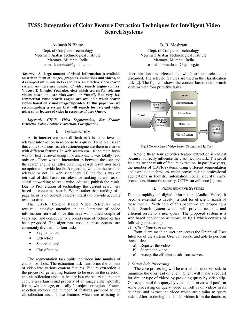 As large amount of visual Information is available on web in form of images, graphics, animations and videos, so it is important in internet era to have an effective video search system. As there are number of video search engine (blinkx, Videosurf, Google, YouTube, etc.) which search for relevant videos based on user keyword or term, But very less commercial video search engine are available which search videos based on visual image/clip/video. In this paper we are recommending a system that will search for relevant video using color feature of video in response of user Query.