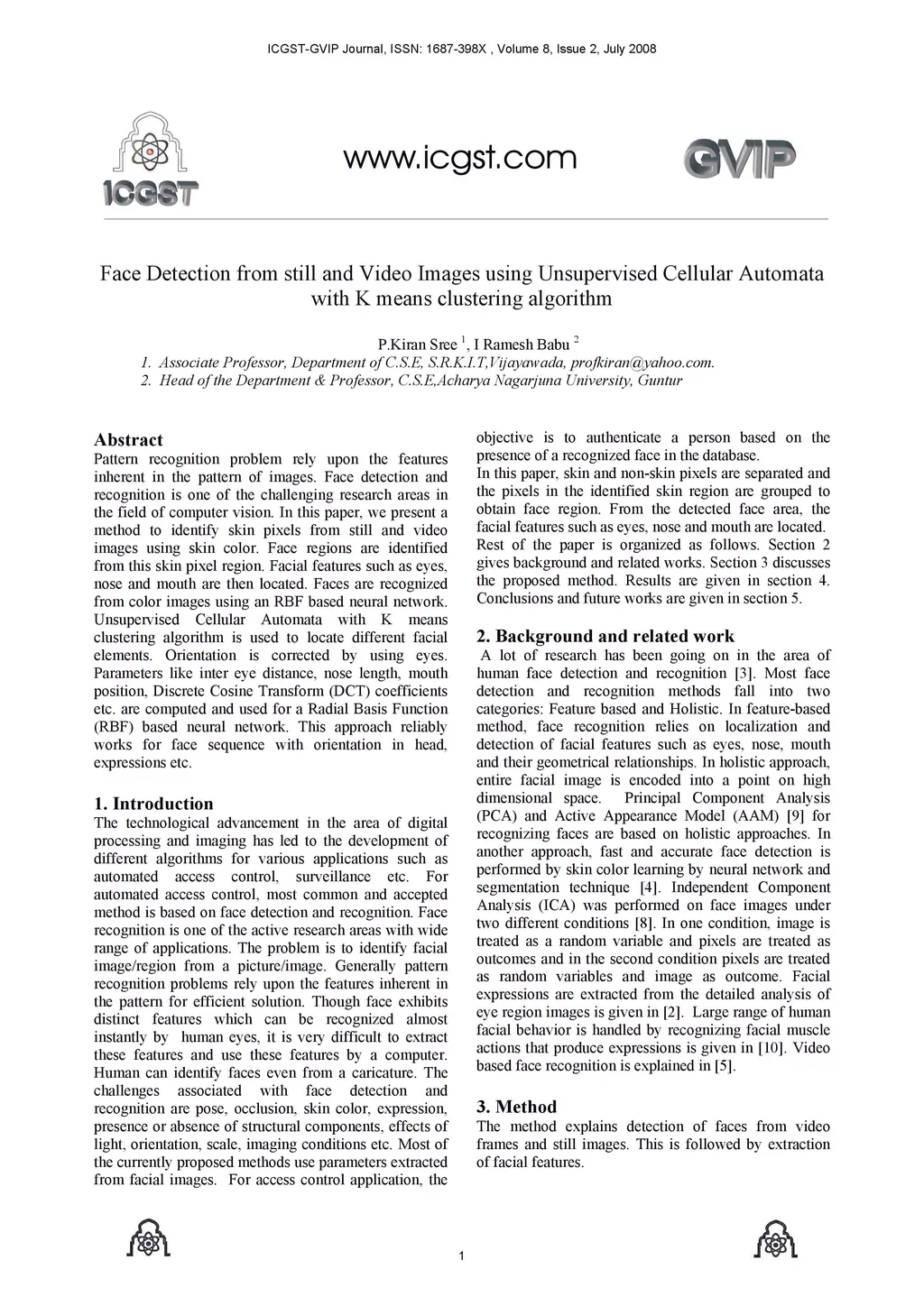 Pattern recognition problem rely upon the features inherent in the pattern of images. Face detection and recognition is one of the challenging research areas in the field of computer vision. In this paper, we present a method to identify skin pixels from still and video images using skin color. Face regions are identified from this skin pixel region. Facial features such as eyes, nose and mouth are then located. Faces are recognized from color images using an RBF based neural network. Unsupervised Cellular Automata with K means clustering algorithm is used to locate different facial elements. Orientation is corrected by using eyes. Parameters like inter eye distance, nose length, mouth position, Discrete Cosine Transform (DCT) coefficients etc. are computed and used for a Radial Basis Function (RBF) based neural network. This approach reliably works for face sequence with orientation in head, expressions etc.