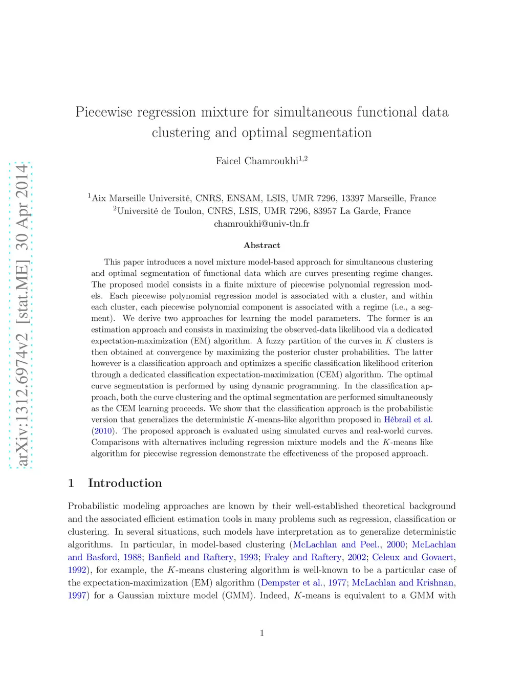 This paper introduces a novel mixture model-based approach for simultaneous clustering and optimal segmentation of functional data which are curves presenting regime changes. The proposed model consists in a finite mixture of piecewise polynomial regression models. Each piecewise polynomial regression model is associated with a cluster, and within each cluster, each piecewise polynomial component is associated with a regime (i.e., a segment). We derive two approaches for learning the model parameters. The former is an estimation approach and consists in maximizing the observed-data likelihood via a dedicated expectation-maximization (EM) algorithm. A fuzzy partition of the curves in K clusters is then obtained at convergence by maximizing the posterior cluster probabilities. The latter however is a classification approach and optimizes a specific classification likelihood criterion through a dedicated classification expectation-maximization (CEM) algorithm. The optimal curve segmentation is performed by using dynamic programming. In the classification approach, both the curve clustering and the optimal segmentation are performed simultaneously as the CEM learning proceeds. We show that the classification approach is the probabilistic version that generalizes the deterministic K-means-like algorithm proposed in H\ébrail et al. (2010). The proposed approach is evaluated using simulated curves and real-world curves. Comparisons with alternatives including regression mixture models and the K-means like algorithm for piecewise regression demonstrate the effectiveness of the proposed approach.