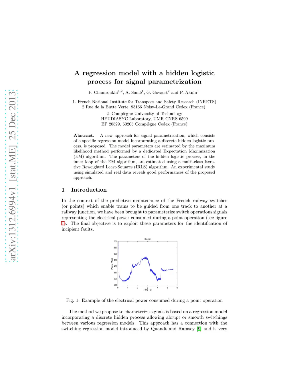 A new approach for signal parametrization, which consists of a specific regression model incorporating a discrete hidden logistic process, is proposed. The model parameters are estimated by the maximum likelihood method performed by a dedicated Expectation Maximization (EM) algorithm. The parameters of the hidden logistic process, in the inner loop of the EM algorithm, are estimated using a multi-class Iterative Reweighted Least-Squares (IRLS) algorithm. An experimental study using simulated and real data reveals good performances of the proposed approach.
