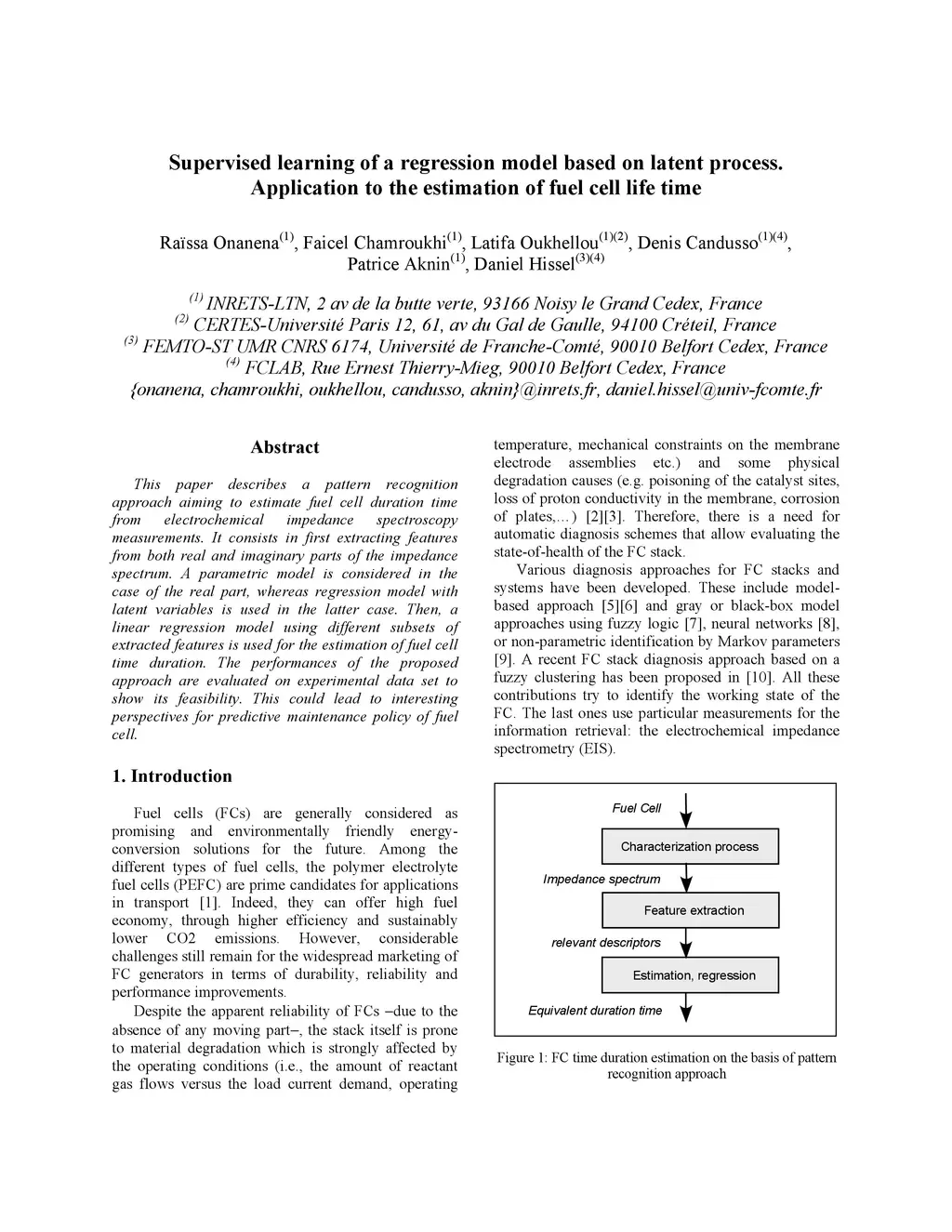 This paper describes a pattern recognition approach aiming to estimate fuel cell duration time from electrochemical impedance spectroscopy measurements. It consists in first extracting features from both real and imaginary parts of the impedance spectrum. A parametric model is considered in the case of the real part, whereas regression model with latent variables is used in the latter case. Then, a linear regression model using different subsets of extracted features is used fo r the estimation of fuel cell time duration. The performances of the proposed approach are evaluated on experimental data set to show its feasibility. This could lead to interesting perspectives for predictive maintenance policy of fuel cell.