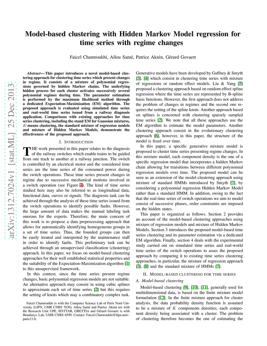 This paper introduces a novel model-based clustering approach for clustering time series which present changes in regime. It consists of a mixture of polynomial regressions governed by hidden Markov chains. The underlying hidden process for each cluster activates successively several polynomial regimes during time. The parameter estimation is performed by the maximum likelihood method through a dedicated Expectation-Maximization (EM) algorithm. The proposed approach is evaluated using simulated time series and real-world time series issued from a railway diagnosis application. Comparisons with existing approaches for time series clustering, including the stand EM for Gaussian mixtures, -means clustering, the standard mixture of regression models and mixture of Hidden Markov Models, demonstrate the effectiveness of the proposed approach.