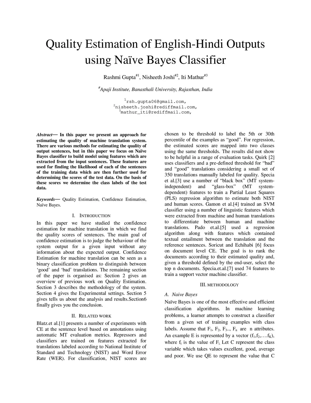 Quality Estimation of English-Hindi Outputs using Naive Bayes Classifier