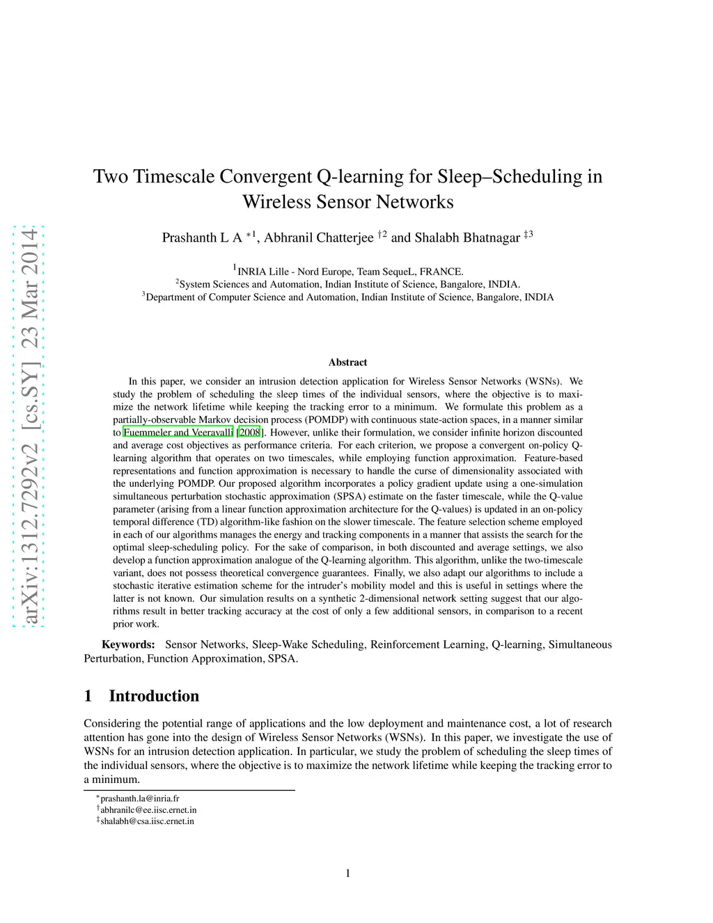 Two Timescale Convergent Q-learning for Sleep--Scheduling in Wireless