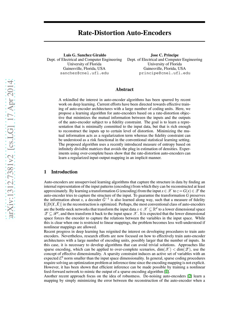 A rekindled the interest in auto-encoder algorithms has been spurred by recent work on deep learning. Current efforts have been directed towards effective training of auto-encoder architectures with a large number of coding units. Here, we propose a learning algorithm for auto-encoders based on a rate-distortion objective that minimizes the mutual information between the inputs and the outputs of the auto-encoder subject to a fidelity constraint. The goal is to learn a representation that is minimally committed to the input data, but that is rich enough to reconstruct the inputs up to certain level of distortion. Minimizing the mutual information acts as a regularization term whereas the fidelity constraint can be understood as a risk functional in the conventional statistical learning setting. The proposed algorithm uses a recently introduced measure of entropy based on infinitely divisible matrices that avoids the plug in estimation of densities. Experiments using over-complete bases show that the rate-distortion auto-encoders can learn a regularized input-output mapping in an implicit manner.