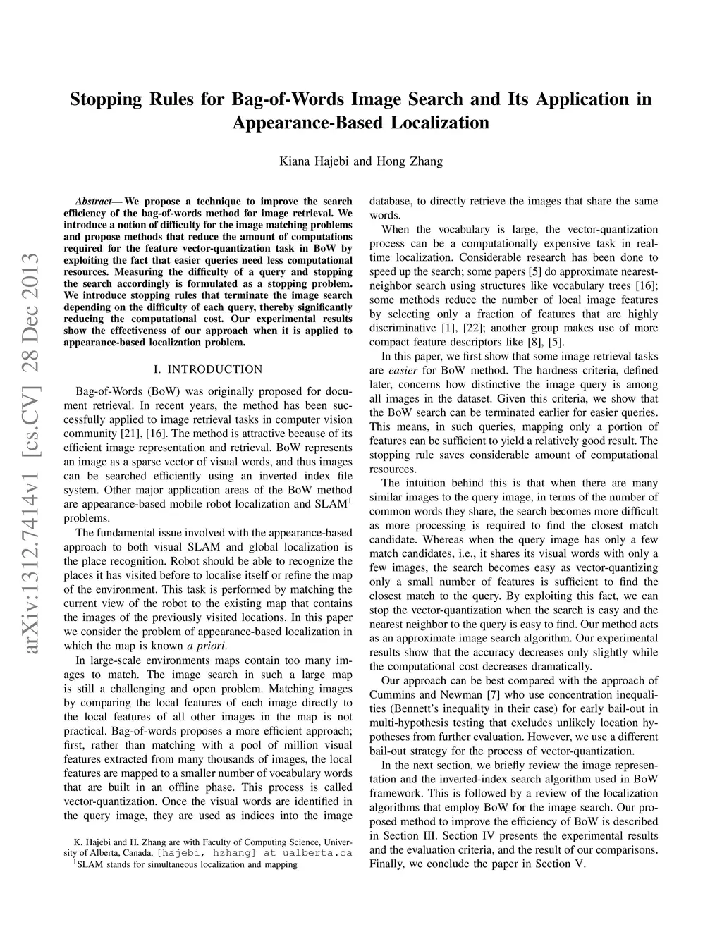 We propose a technique to improve the search efficiency of the bag-of-words (BoW) method for image retrieval. We introduce a notion of difficulty for the image matching problems and propose methods that reduce the amount of computations required for the feature vector-quantization task in BoW by exploiting the fact that easier queries need less computational resources. Measuring the difficulty of a query and stopping the search accordingly is formulated as a stopping problem. We introduce stopping rules that terminate the image search depending on the difficulty of each query, thereby significantly reducing the computational cost. Our experimental results show the effectiveness of our approach when it is applied to appearance-based localization problem.
