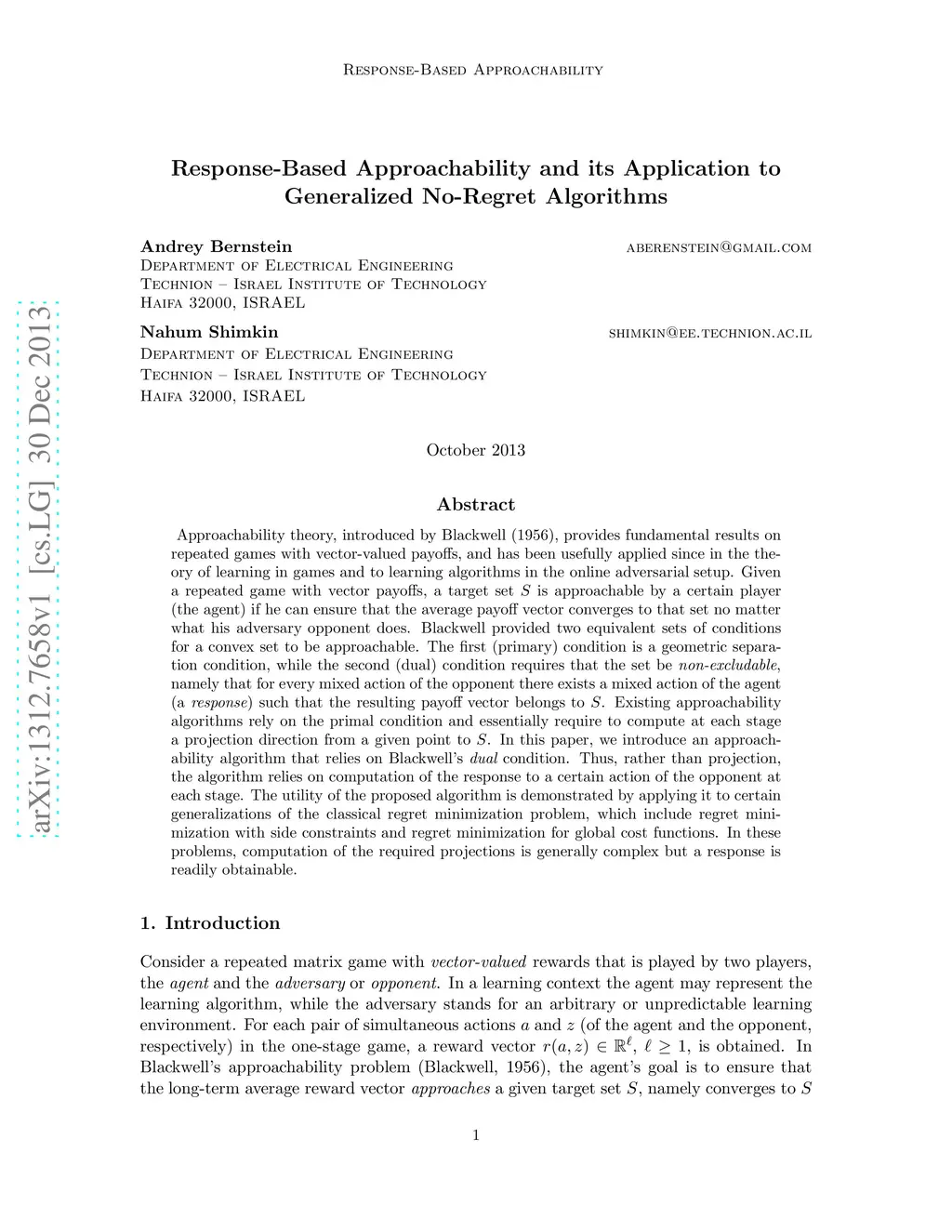 Approachability theory, introduced by Blackwell (1956), provides fundamental results on repeated games with vector-valued payoffs, and has been usefully applied since in the theory of learning in games and to learning algorithms in the online adversarial setup. Given a repeated game with vector payoffs, a target set is approachable by a certain player (the agent) if he can ensure that the average payoff vector converges to that set no matter what his adversary opponent does. Blackwell provided two equivalent sets of conditions for a convex set to be approachable. The first (primary) condition is a geometric separation condition, while the second (dual) condition requires that the set be {\em non-excludable}, namely that for every mixed action of the opponent there exists a mixed action of the agent (a {\em response}) such that the resulting payoff vector belongs to . Existing approachability algorithms rely on the primal condition and essentially require to compute at each stage a projection direction from a given point to . In this paper, we introduce an approachability algorithm that relies on Blackwell's {\em dual} condition. Thus, rather than projection, the algorithm relies on computation of the response to a certain action of the opponent at each stage. The utility of the proposed algorithm is demonstrated by applying it to certain generalizations of the classical regret minimization problem, which include regret minimization with side constraints and regret minimization for global cost functions. In these problems, computation of the required projections is generally complex but a response is readily obtainable.