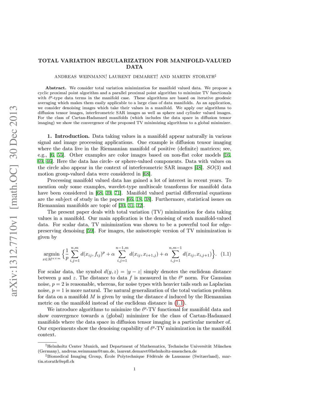 We consider total variation minimization for manifold valued data. We propose a cyclic proximal point algorithm and a parallel proximal point algorithm to minimize TV functionals with -type data terms in the manifold case. These algorithms are based on iterative geodesic averaging which makes them easily applicable to a large class of data manifolds. As an application, we consider denoising images which take their values in a manifold. We apply our algorithms to diffusion tensor images, interferometric SAR images as well as sphere and cylinder valued images. For the class of Cartan-Hadamard manifolds (which includes the data space in diffusion tensor imaging) we show the convergence of the proposed TV minimizing algorithms to a global minimizer.