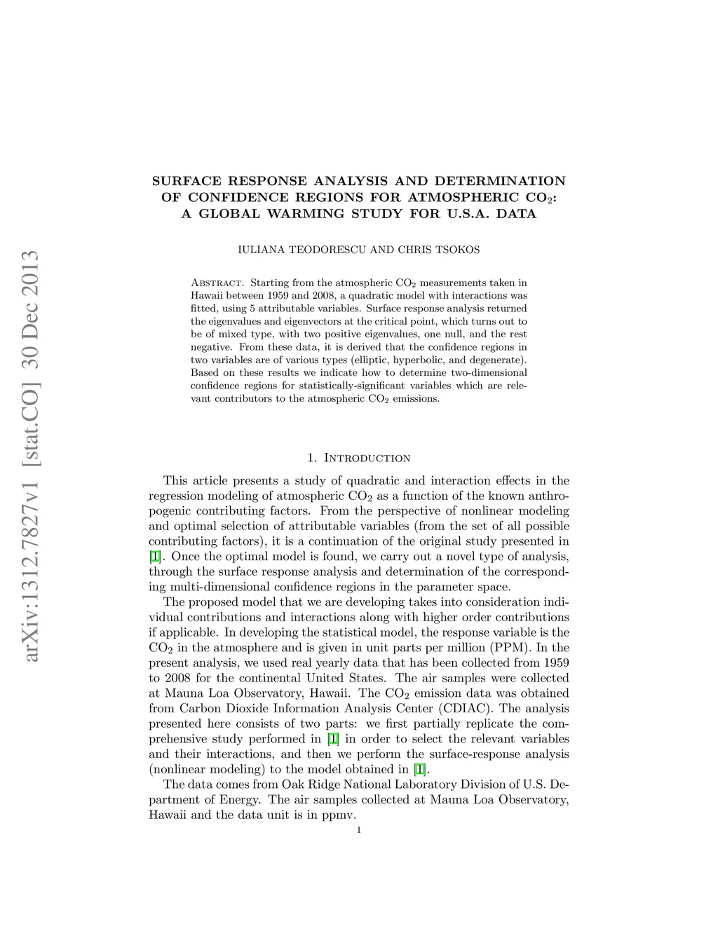 Starting from the atmospheric CO2 measurements taken in Hawaii between 1959 and 2008, a quadratic model with interactions was fitted, using 5 attributable variables. Surface response analysis returned the eigenvalues and eigenvectors at the critical point, which turns out to be of mixed type, with two positive eigenvalues, one null, and the rest negative. From these data, it is derived that the confidence regions in two variables are of various types (elliptic, hyperbolic, and degenerate). Based on these results we indicate how to determine two-dimensional confidence regions for statistically-significant variables which are relevant contributors to the atmospheric CO2 emissions.