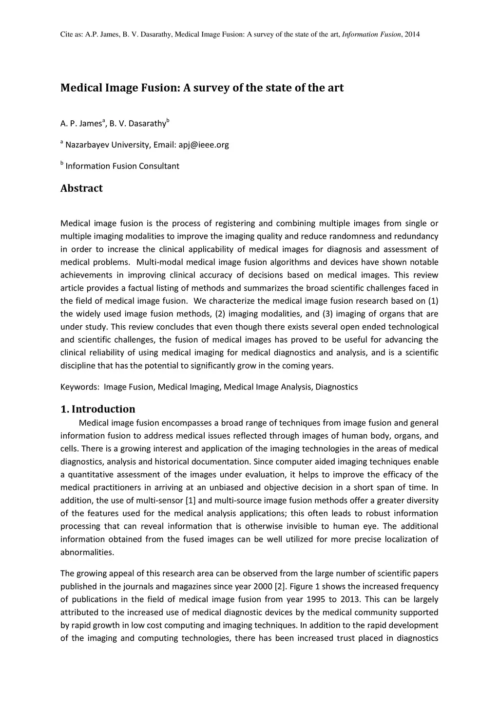 Medical image fusion is the process of registering and combining multiple images from single or multiple imaging modalities to improve the imaging quality and reduce randomness and redundancy in order to increase the clinical applicability of medical images for diagnosis and assessment of medical problems. Multi-modal medical image fusion algorithms and devices have shown notable achievements in improving clinical accuracy of decisions based on medical images. This review article provides a factual listing of methods and summarizes the broad scientific challenges faced in the field of medical image fusion. We characterize the medical image fusion research based on (1) the widely used image fusion methods, (2) imaging modalities, and (3) imaging of organs that are under study. This review concludes that even though there exists several open ended technological and scientific challenges, the fusion of medical images has proved to be useful for advancing the clinical reliability of using medical imaging for medical diagnostics and analysis, and is a scientific discipline that has the potential to significantly grow in the coming years.