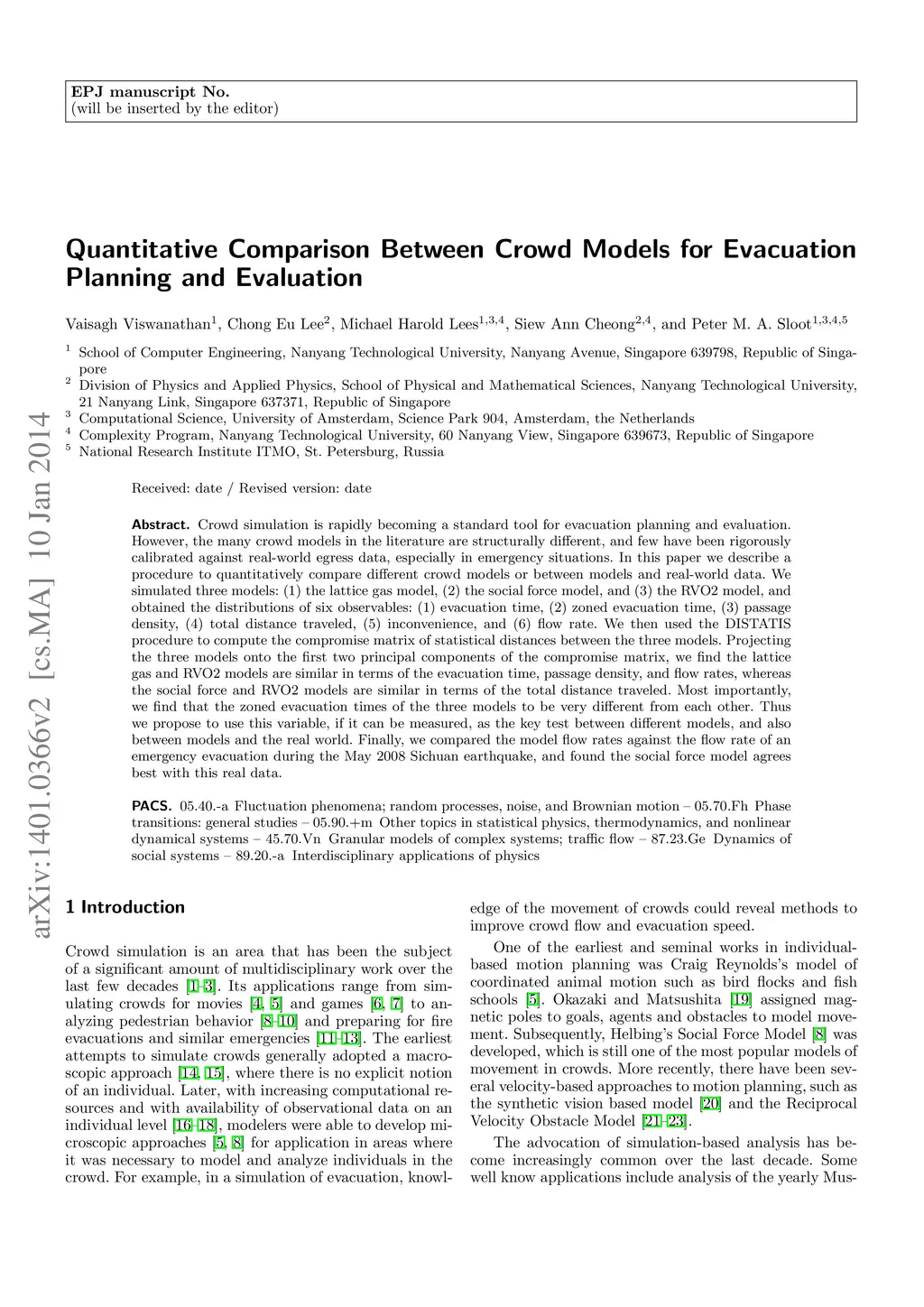 Crowd simulation is rapidly becoming a standard tool for evacuation planning and evaluation. However, the many crowd models in the literature are structurally different, and few have been rigorously calibrated against real-world egress data, especially in emergency situations. In this paper we describe a procedure to quantitatively compare different crowd models or between models and real-world data. We simulated three models: (1) the lattice gas model, (2) the social force model, and (3) the RVO2 model, and obtained the distributions of six observables: (1) evacuation time, (2) zoned evacuation time, (3) passage density, (4) total distance traveled, (5) inconvenience, and (6) flow rate. We then used the DISTATIS procedure to compute the compromise matrix of statistical distances between the three models. Projecting the three models onto the first two principal components of the compromise matrix, we find the lattice gas and RVO2 models are similar in terms of the evacuation time, passage density, and flow rates, whereas the social force and RVO2 models are similar in terms of the total distance traveled. Most importantly, we find that the zoned evacuation times of the three models to be very different from each other. Thus we propose to use this variable, if it can be measured, as the key test between different models, and also between models and the real world. Finally, we compared the model flow rates against the flow rate of an emergency evacuation during the May 2008 Sichuan earthquake, and found the social force model agrees best with this real data.