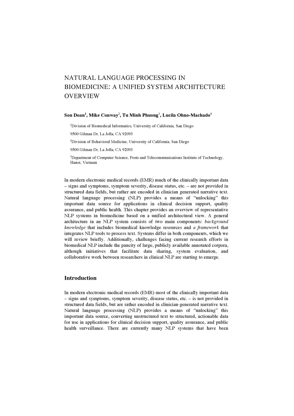 In modern electronic medical records (EMR) much of the clinically important data - signs and symptoms, symptom severity, disease status, etc. - are not provided in structured data fields, but rather are encoded in clinician generated narrative text. Natural language processing (NLP) provides a means of "unlocking" this important data source for applications in clinical decision support, quality assurance, and public health. This chapter provides an overview of representative NLP systems in biomedicine based on a unified architectural view. A general architecture in an NLP system consists of two main components: background knowledge that includes biomedical knowledge resources and a framework that integrates NLP tools to process text. Systems differ in both components, which we will review briefly. Additionally, challenges facing current research efforts in biomedical NLP include the paucity of large, publicly available annotated corpora, although initiatives that facilitate data sharing, system evaluation, and collaborative work between researchers in clinical NLP are starting to emerge.