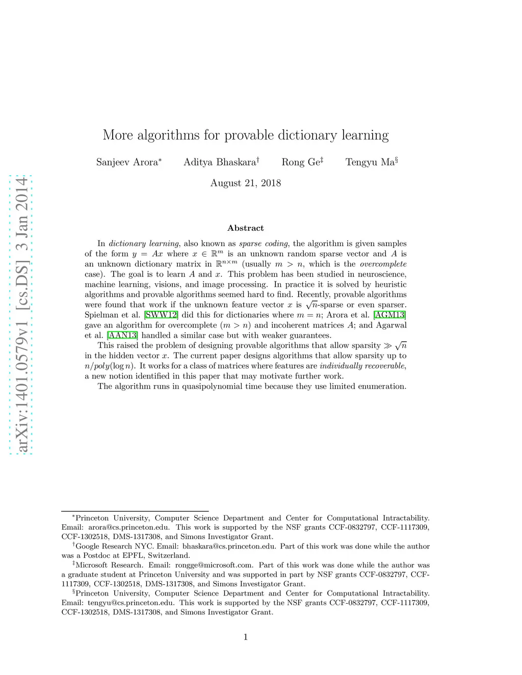 In dictionary learning, also known as sparse coding, the algorithm is given samples of the form where is an unknown random sparse vector and is an unknown dictionary matrix in (usually , which is the overcomplete case). The goal is to learn and . This problem has been studied in neuroscience, machine learning, visions, and image processing. In practice it is solved by heuristic algorithms and provable algorithms seemed hard to find. Recently, provable algorithms were found that work if the unknown feature vector is -sparse or even sparser. Spielman et al. \cite{DBLP:journals/jmlr/SpielmanWW12} did this for dictionaries where ; Arora et al. \cite{AGM} gave an algorithm for overcomplete () and incoherent matrices ; and Agarwal et al. \cite{DBLP:journals/corr/AgarwalAN13} handled a similar case but with weaker guarantees. This raised the problem of designing provable algorithms that allow sparsity in the hidden vector . The current paper designs algorithms that allow sparsity up to . It works for a class of matrices where features are individually recoverable, a new notion identified in this paper that may motivate further work. The algorithm runs in quasipolynomial time because they use limited enumeration.