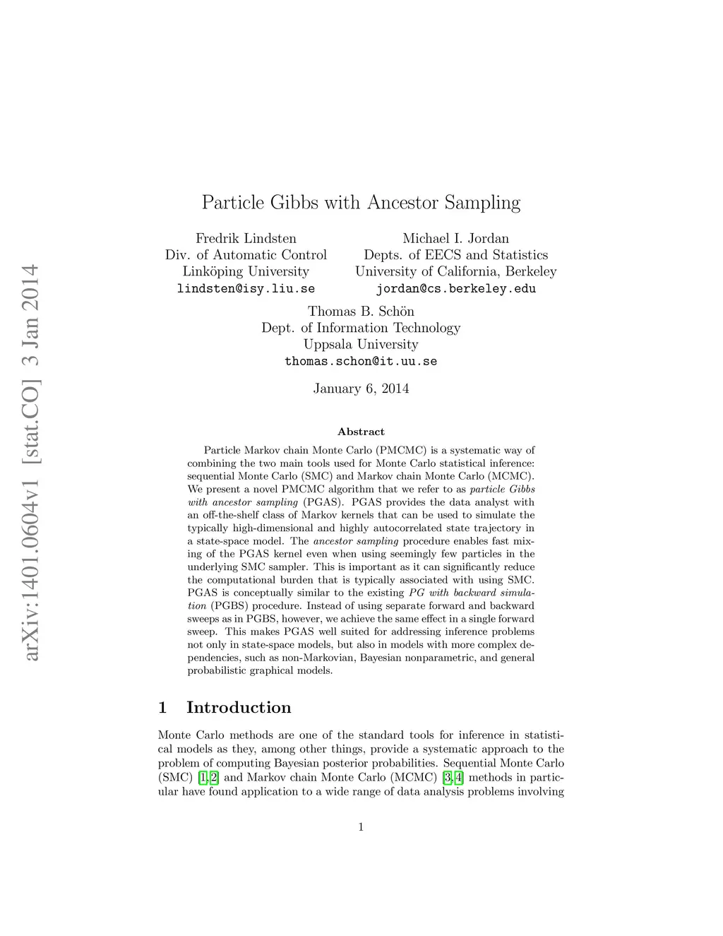 Particle Markov chain Monte Carlo (PMCMC) is a systematic way of combining the two main tools used for Monte Carlo statistical inference: sequential Monte Carlo (SMC) and Markov chain Monte Carlo (MCMC). We present a novel PMCMC algorithm that we refer to as particle Gibbs with ancestor sampling (PGAS). PGAS provides the data analyst with an off-the-shelf class of Markov kernels that can be used to simulate the typically high-dimensional and highly autocorrelated state trajectory in a state-space model. The ancestor sampling procedure enables fast mixing of the PGAS kernel even when using seemingly few particles in the underlying SMC sampler. This is important as it can significantly reduce the computational burden that is typically associated with using SMC. PGAS is conceptually similar to the existing PG with backward simulation (PGBS) procedure. Instead of using separate forward and backward sweeps as in PGBS, however, we achieve the same effect in a single forward sweep. This makes PGAS well suited for addressing inference problems not only in state-space models, but also in models with more complex dependencies, such as non-Markovian, Bayesian nonparametric, and general probabilistic graphical models.