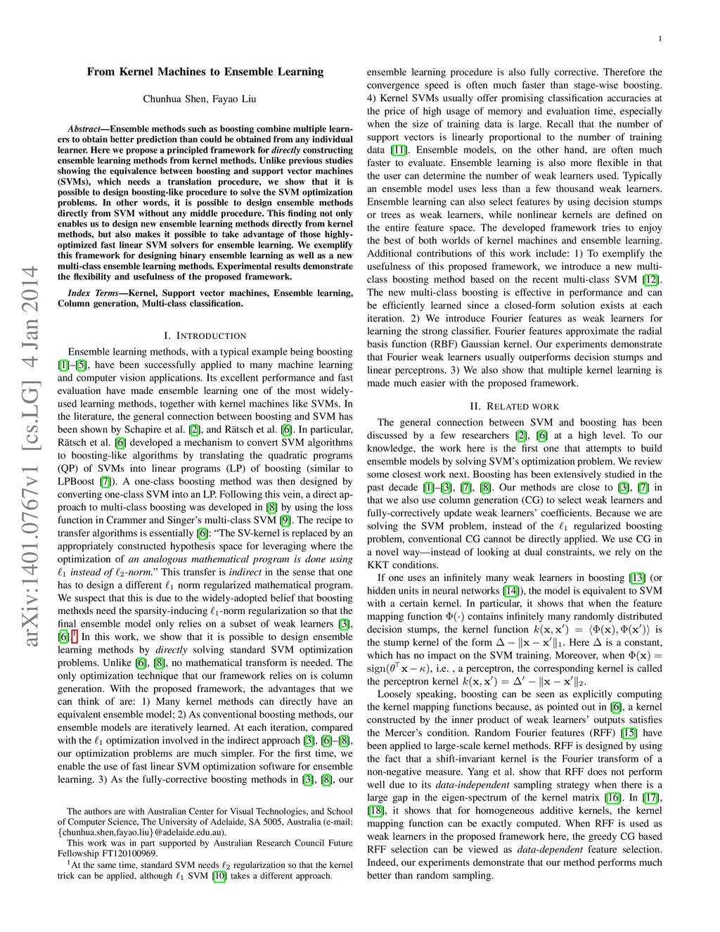 Ensemble methods such as boosting combine multiple learners to obtain better prediction than could be obtained from any individual learner. Here we propose a principled framework for directly constructing ensemble learning methods from kernel methods. Unlike previous studies showing the equivalence between boosting and support vector machines (SVMs), which needs a translation procedure, we show that it is possible to design boosting-like procedure to solve the SVM optimization problems. In other words, it is possible to design ensemble methods directly from SVM without any middle procedure. This finding not only enables us to design new ensemble learning methods directly from kernel methods, but also makes it possible to take advantage of those highly-optimized fast linear SVM solvers for ensemble learning. We exemplify this framework for designing binary ensemble learning as well as a new multi-class ensemble learning methods. Experimental results demonstrate the flexibility and usefulness of the proposed framework.