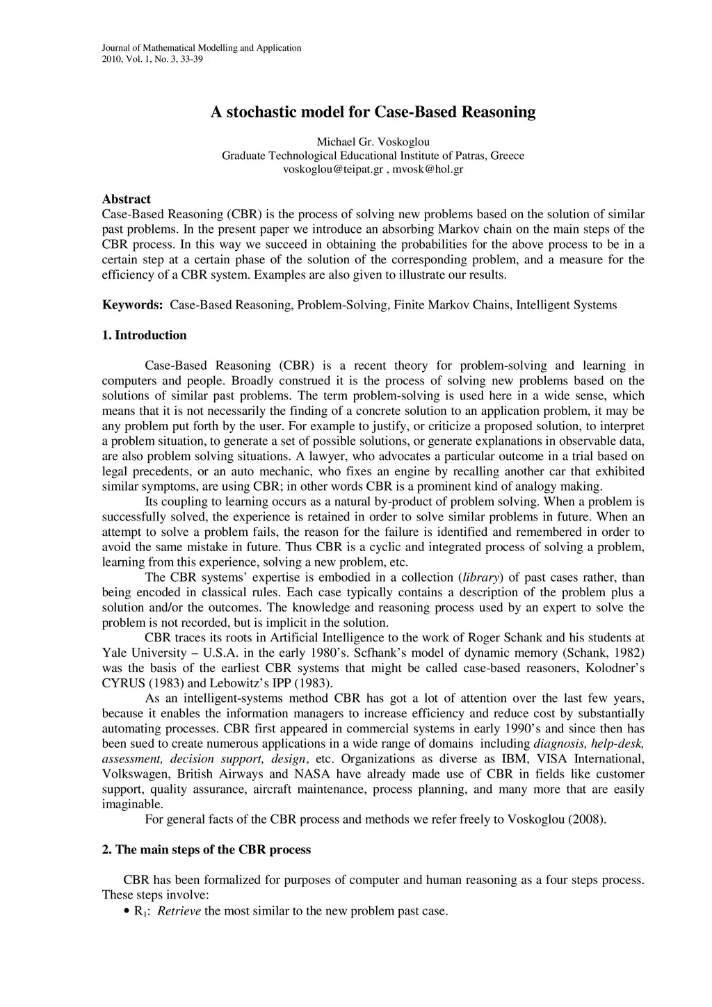Case-Bsed Reasoning (CBR) is a recent theory for problem-solving and learning in computers and people.Broadly construed it is the process of solving new problems based on the solution of similar past problems. In the present paper we introduce an absorbing Markov chain on the main steps of the CBR process.In this way we succeed in obtaining the probabilities for the above process to be in a certain step at a certain phase of the solution of the corresponding problem, and a measure for the efficiency of a CBR system. Examples are given to illustrate our results.