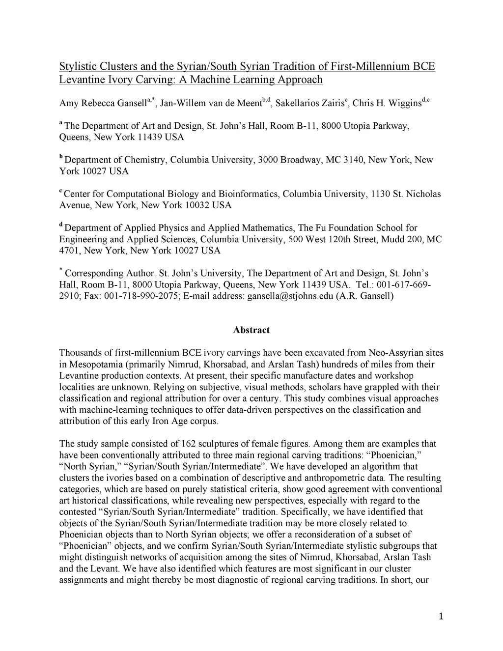 Thousands of first-millennium BCE ivory carvings have been excavated from Neo-Assyrian sites in Mesopotamia (primarily Nimrud, Khorsabad, and Arslan Tash) hundreds of miles from their Levantine production contexts. At present, their specific manufacture dates and workshop localities are unknown. Relying on subjective, visual methods, scholars have grappled with their classification and regional attribution for over a century. This study combines visual approaches with machine-learning techniques to offer data-driven perspectives on the classification and attribution of this early Iron Age corpus. The study sample consisted of 162 sculptures of female figures. We have developed an algorithm that clusters the ivories based on a combination of descriptive and anthropometric data. The resulting categories, which are based on purely statistical criteria, show good agreement with conventional art historical classifications, while revealing new perspectives, especially with regard to the contested Syrian/South Syrian/Intermediate tradition. Specifically, we have identified that objects of the Syrian/South Syrian/Intermediate tradition may be more closely related to Phoenician objects than to North Syrian objects; we offer a reconsideration of a subset of Phoenician objects, and we confirm Syrian/South Syrian/Intermediate stylistic subgroups that might distinguish networks of acquisition among the sites of Nimrud, Khorsabad, Arslan Tash and the Levant. We have also identified which features are most significant in our cluster assignments and might thereby be most diagnostic of regional carving traditions. In short, our study both corroborates traditional visual classification methods and demonstrates how machine-learning techniques may be employed to reveal complementary information not accessible through the exclusively visual analysis of an archaeological corpus.